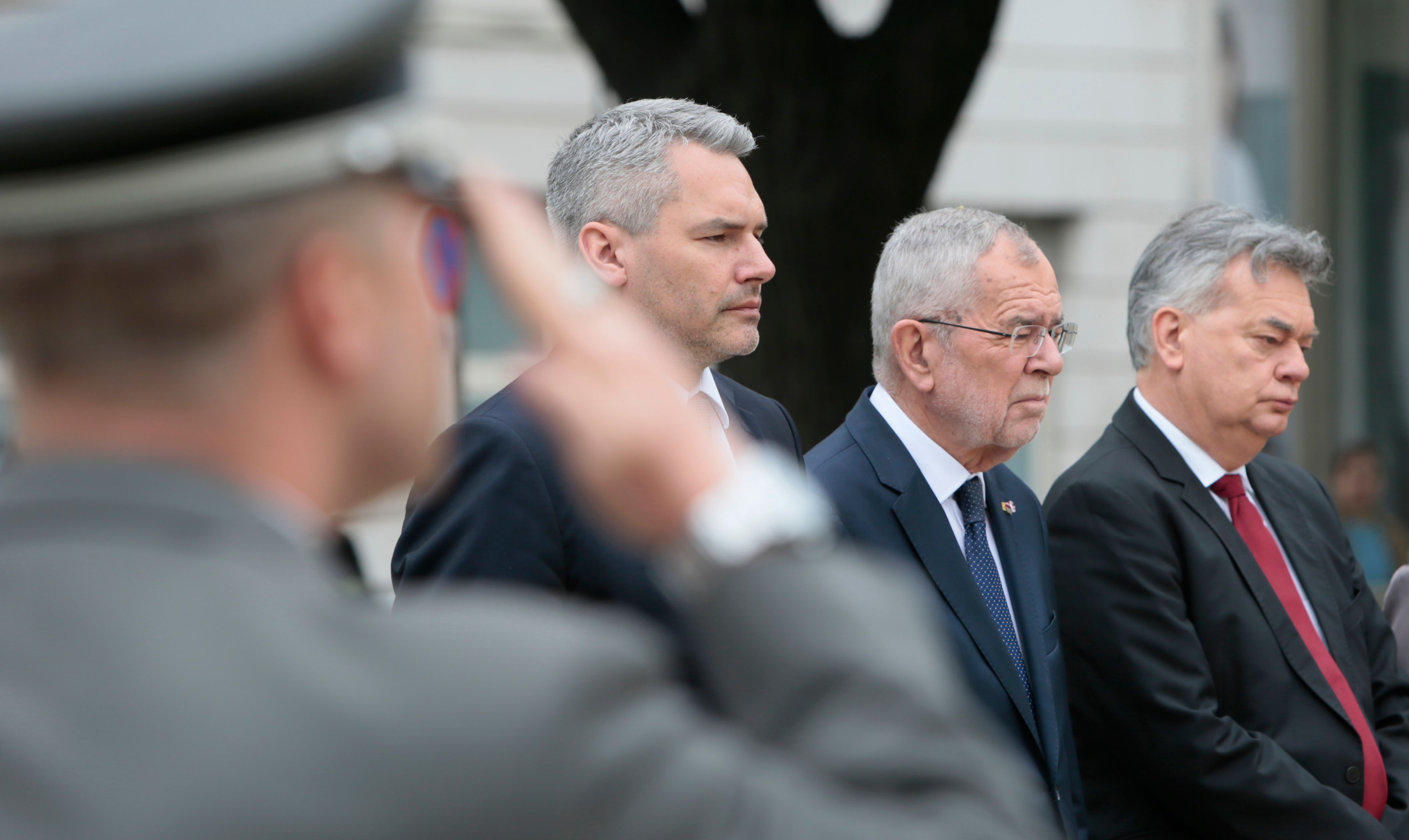 Kanzler Nehammer, Bundespräsident Van der Bellen und Vizekanzler Kogler bei der Kranzniederlegung zum Gedenken der Kriegsopfer.