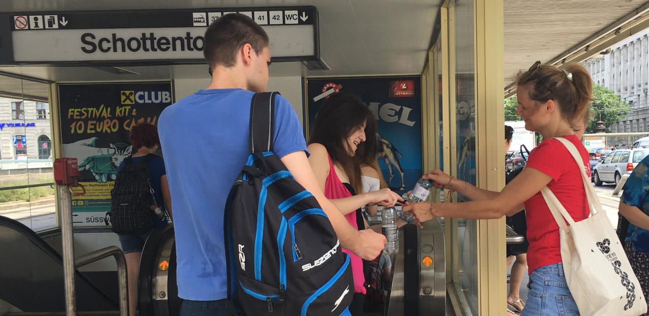Wiener Linien verteilten am Mittwoch Wasserflaschen am Schottentor.