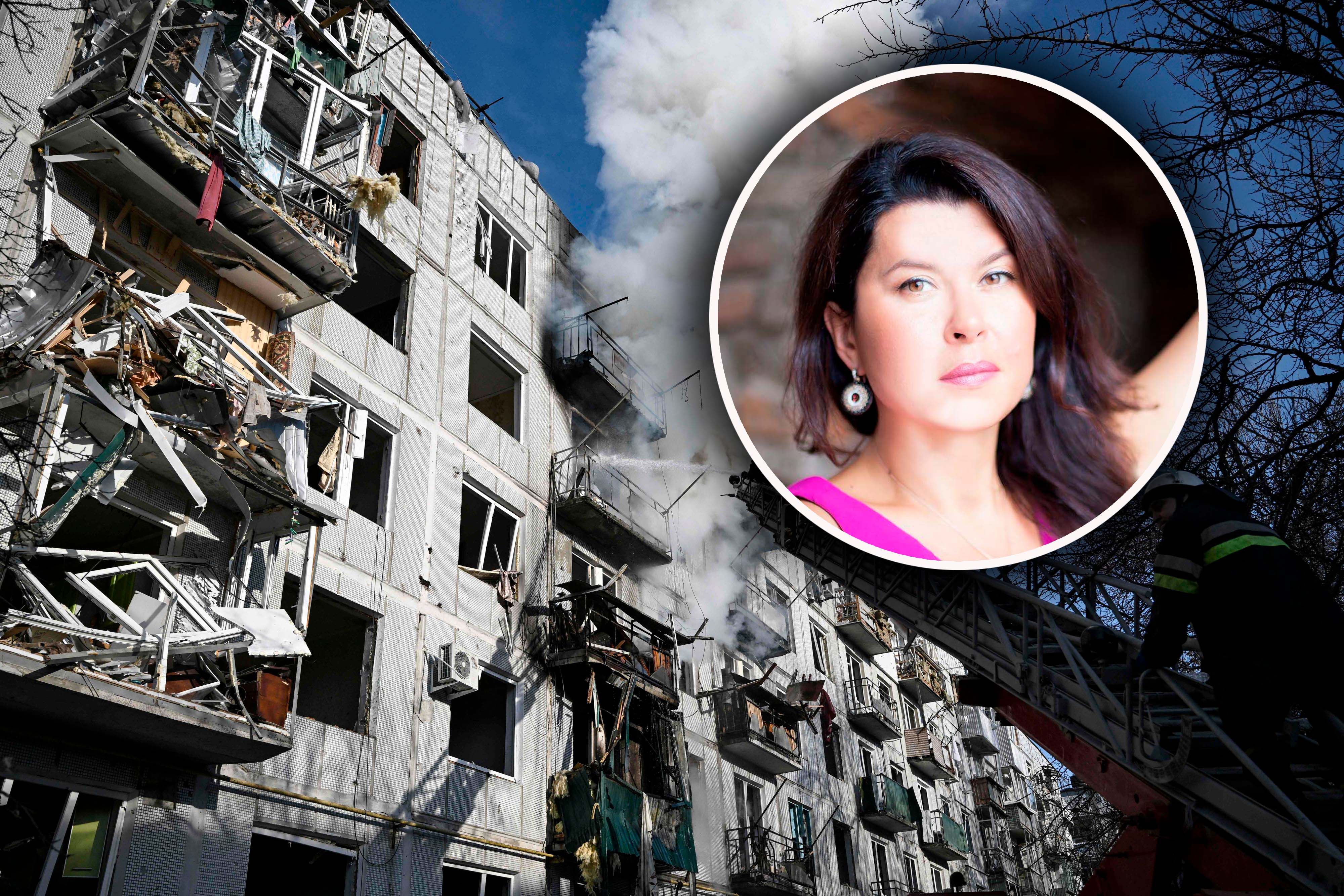 Zerstörte Wohnhäuser in der Umgebung von Kharkiv nach dem russischen Raktenangriff; Opernsängerin Zoryana Kushpler hat Angst um Freunde und Verwandte.