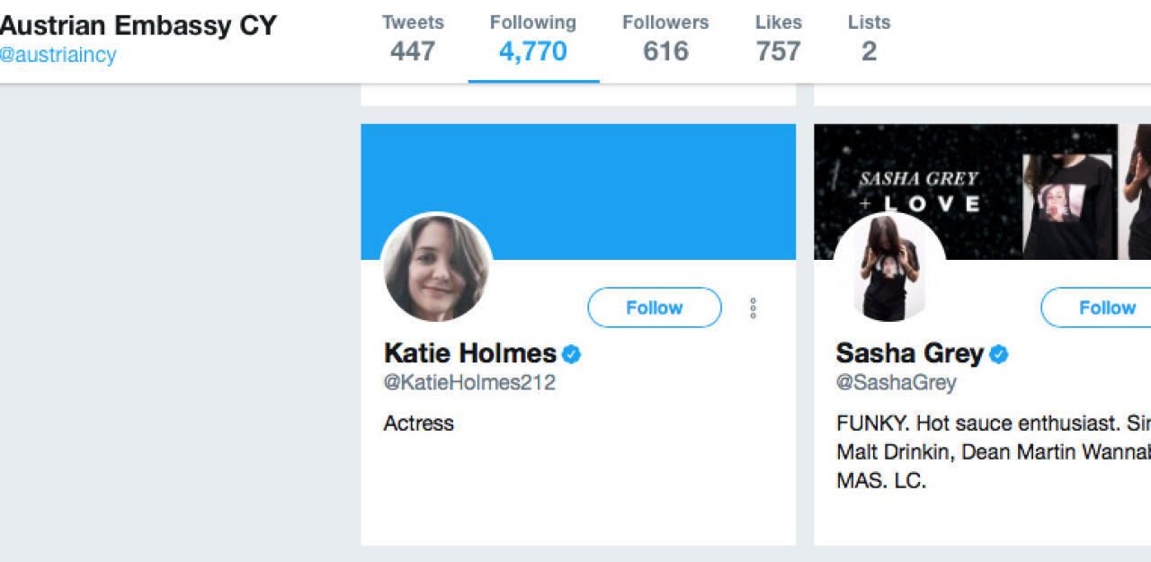 Die Österreichische Botschaft in Nicosia (Zypern) folgt auf Twitter Pornostar Sasha Grey.