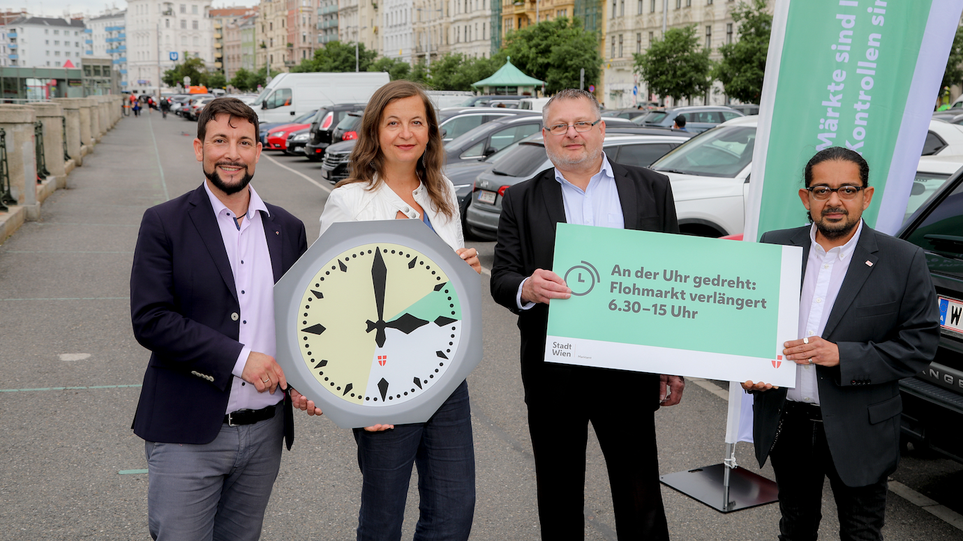 V.l.n.r.: Bezirksvorsteher Markus Rumelhart, Planungsstafträtin Ulli Sima, Abteilungsleiter der MA 59 Andreas Kutheil und stellv. Obmann für den allgemeinen Handel in der WK Wien Amir Peyman