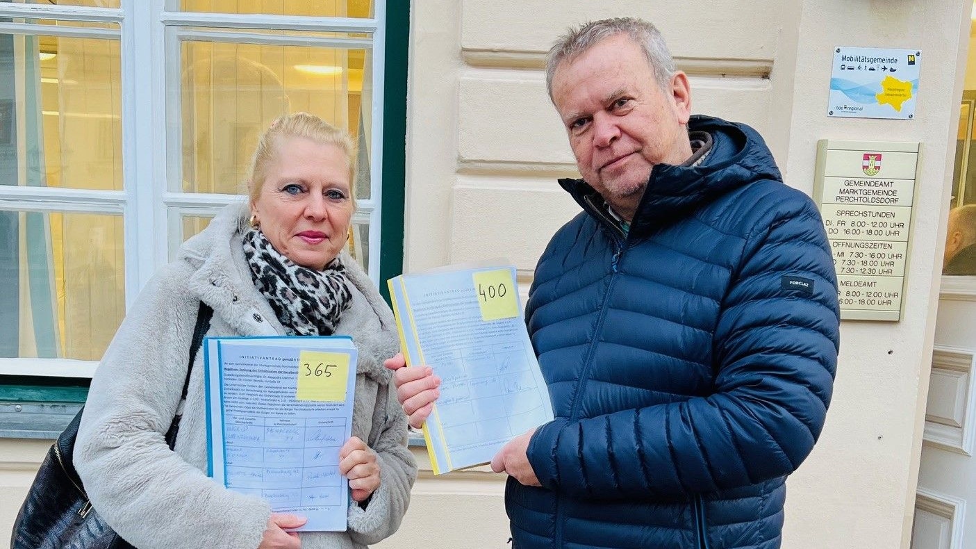 Die beiden Augenärzte Dr. Alexandra Crammer und Dr. Florian Skorpik übergaben 765 Unterschriften für eine Senkung der beschlossenen Kanalgebühren-Erhöhung an die Bürgermeisterin.