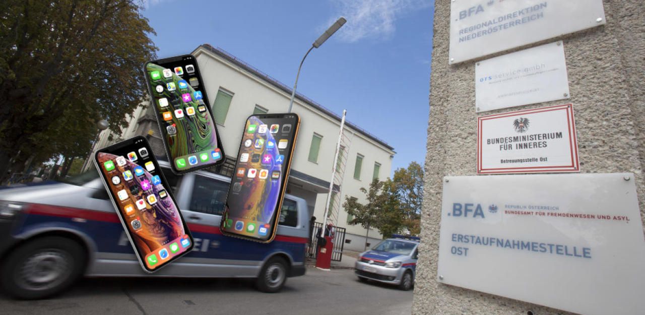 Das Asylzentrum und Symbolfotos von Handys.