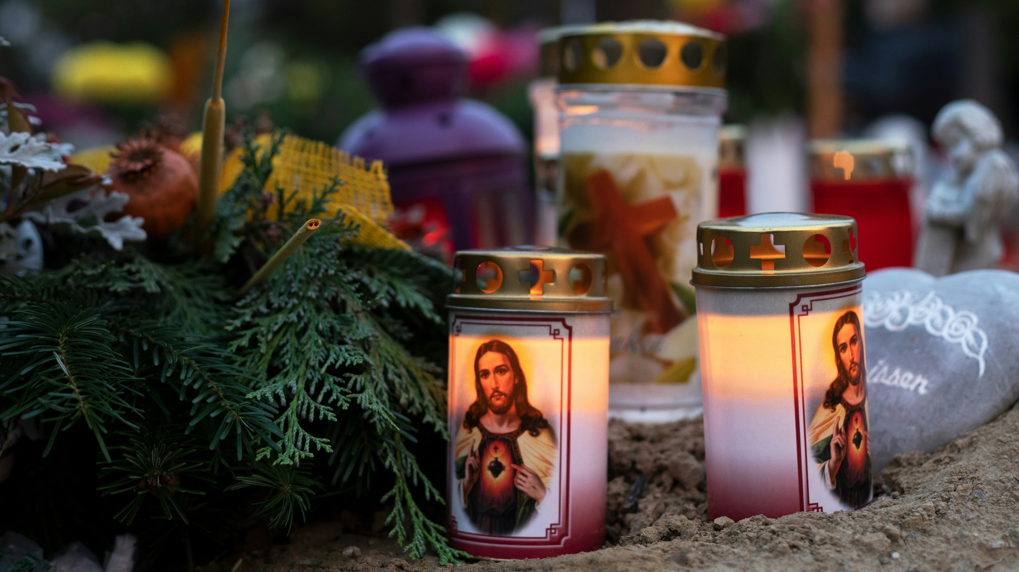 Kerzen brennen in der Abendstimmung an Gräbern am Zentrafriedhof in Wien.