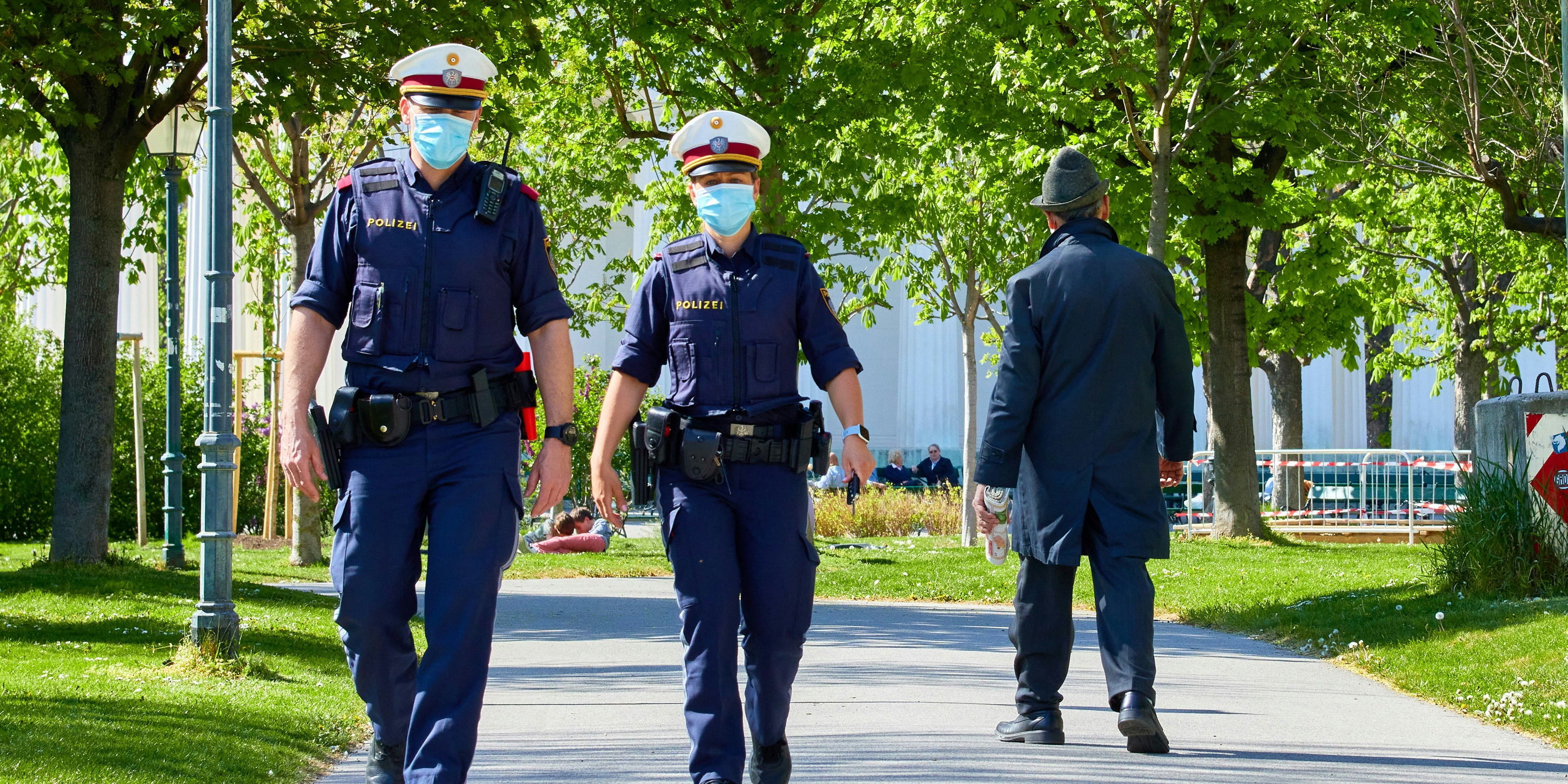 Die Beamten der Polizei sind mit Schutzmaske unterwegs