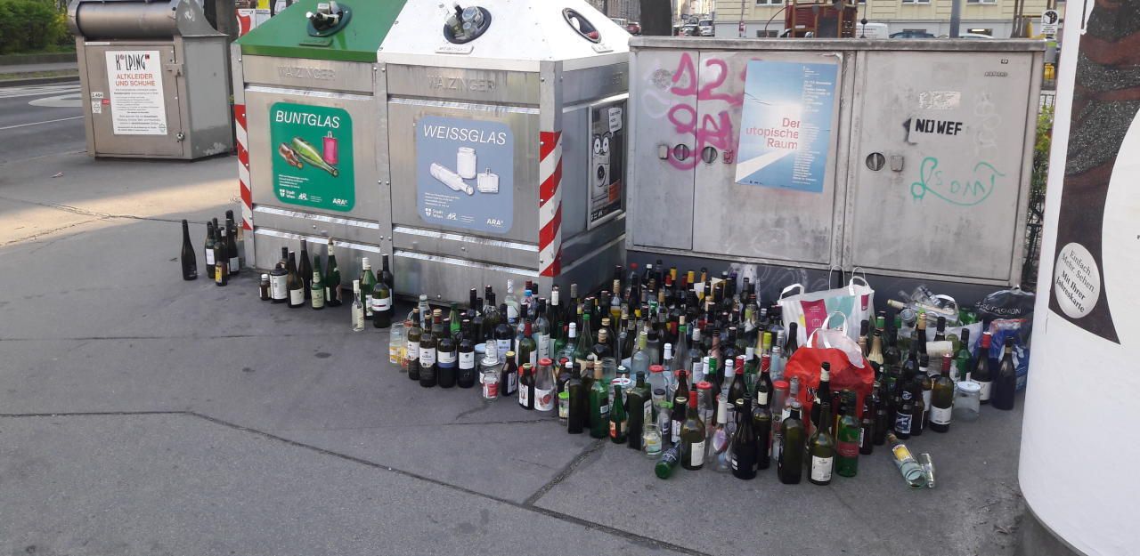 Wein, Bier, Schnaps und einige wenige Fruchtsäfte vor Container in Wien