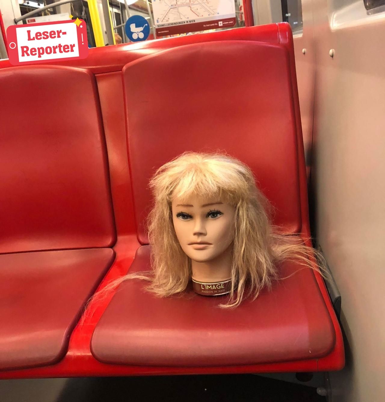 Herrenloser Puppenkopf fährt mit U1 Richtung Oberlaa.