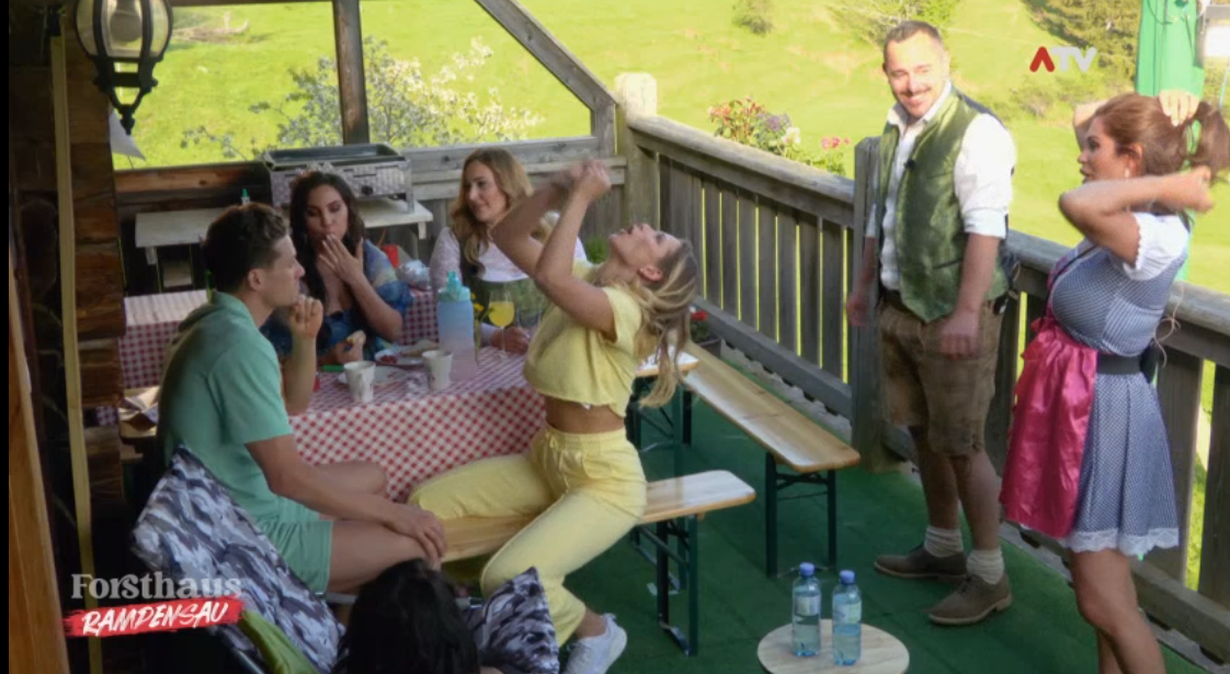 Maria demonstriert, wie sie eine Kuh melken würde.