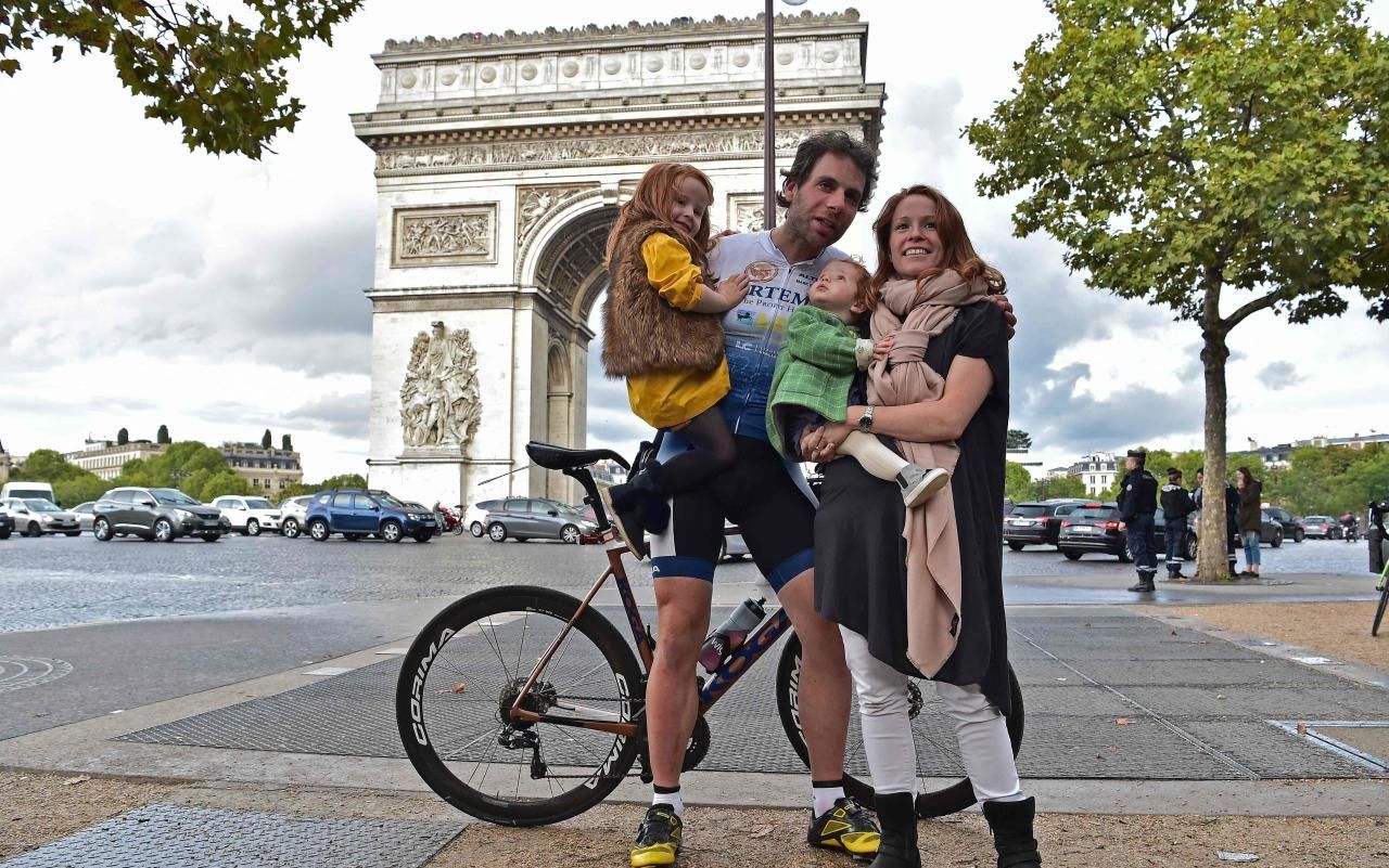 Mark Beaumont ist zurück in Paris und nimmt seine Familie in den Arm.