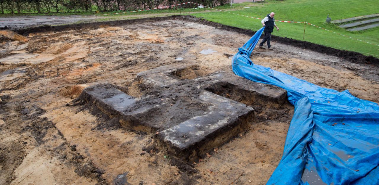 Ein Platzwart entfernt am 21.11.2017 im Hein-Kling Stadion in Hamburg-Billstedt eine Abdeckplane von einem Hakenkreuz aus Beton neben dem Sportplatz. Bei Bauarbeiten für neue Umkleidekabinen auf dem Hamburger Sportplatz ist ein Baggerfahrer auf das riesige Hakenkreuz gestoßen. Das Hakenkreuz aus Beton ist vier mal vier Meter groß und diente in der NS-Zeit als Fundament für ein großes Denkmal.