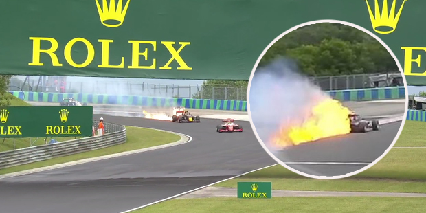 Formel-3-Pilot Liam Lawson verliert Öl. Sein Heck geht in Flammen auf.
