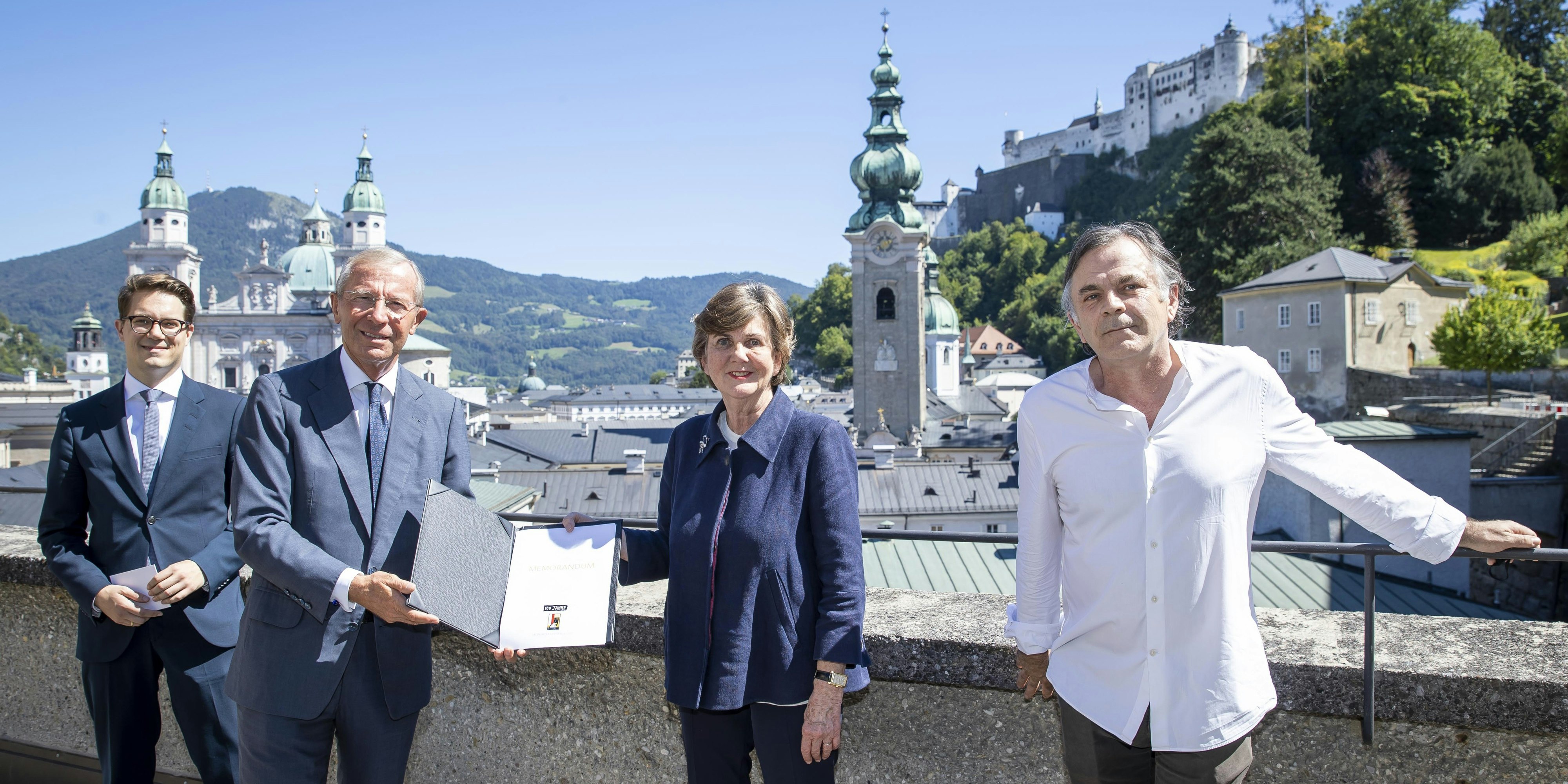 Präsentation des Memorandums der Salzburger Festspiele im Bild: Kaufmännischer Direktor der Salzburger Festspiele Lukas Crepaz, Landeshauptmann Wilfried Haslauer, Präsidentin Helga Rabl Stadler, Intendant Markus Hinterhäuser.