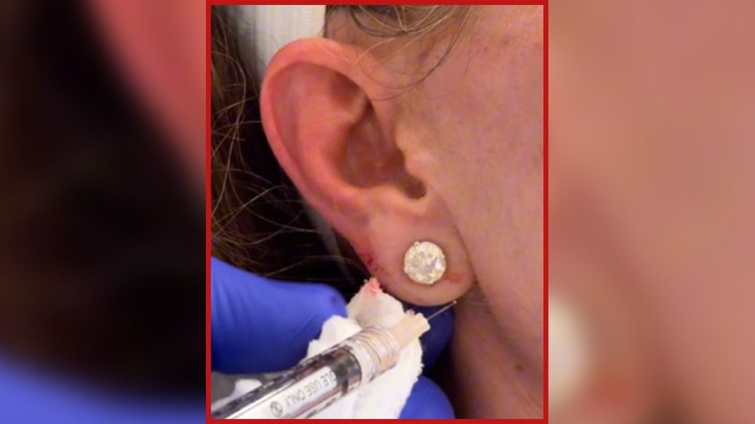 Wenige Sekunden dauert der Eingriff, bei dem ein Ohrläppchen mit Hyaluron wieder aufgefüllt wird.