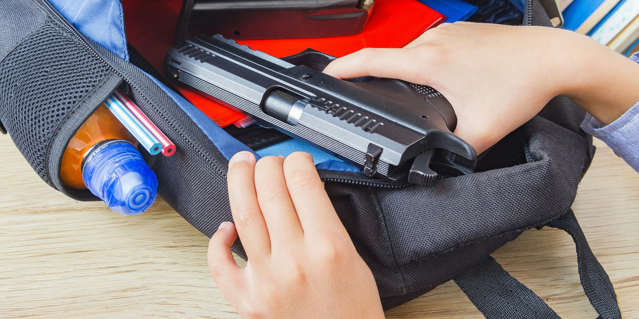 Ein junger Schüler zieht eine Pistole aus seinem Rucksack. (Symbolbild)