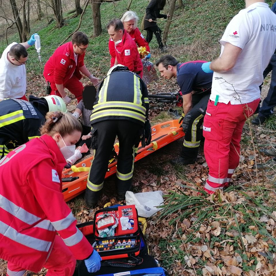 Die Frau brach sich beim Sturz das Bein, musste mit der Schleifkorbtrage aus dem Wald gebracht werden.