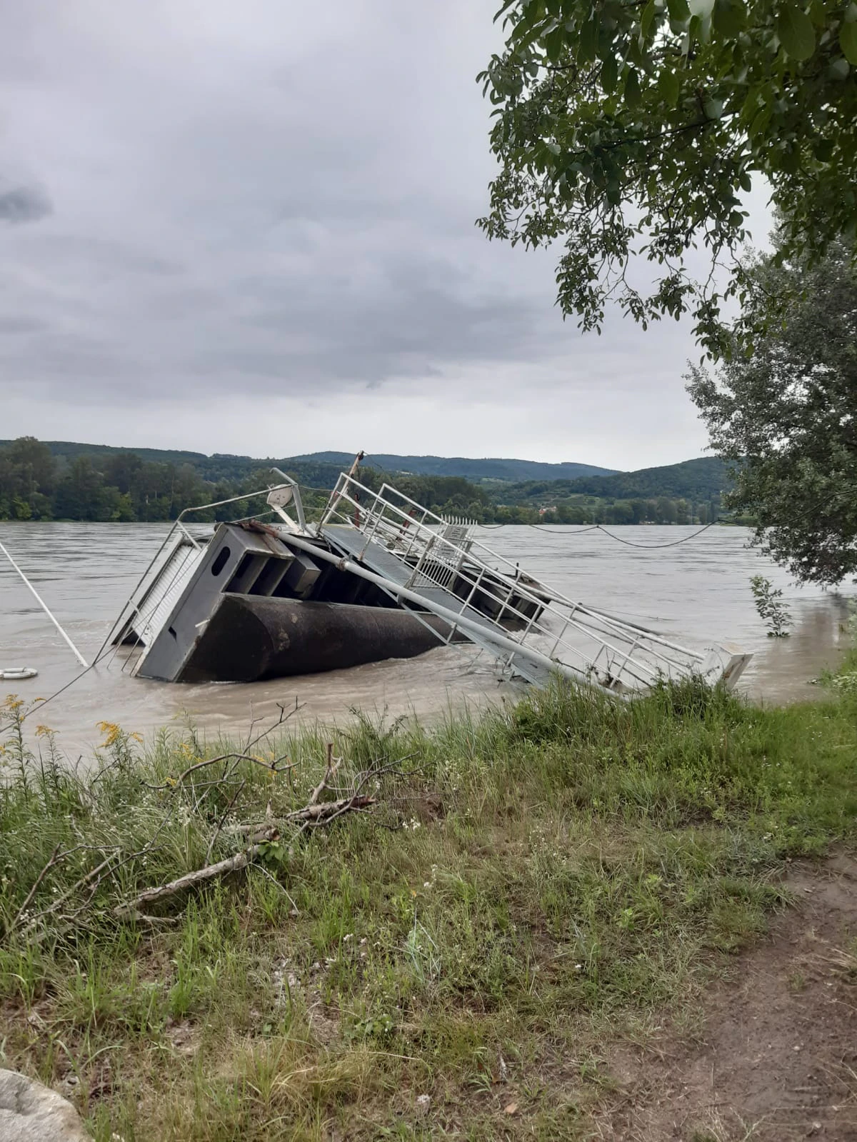 Nach Starkregen kenterte eine schwimmende Tankstelle.