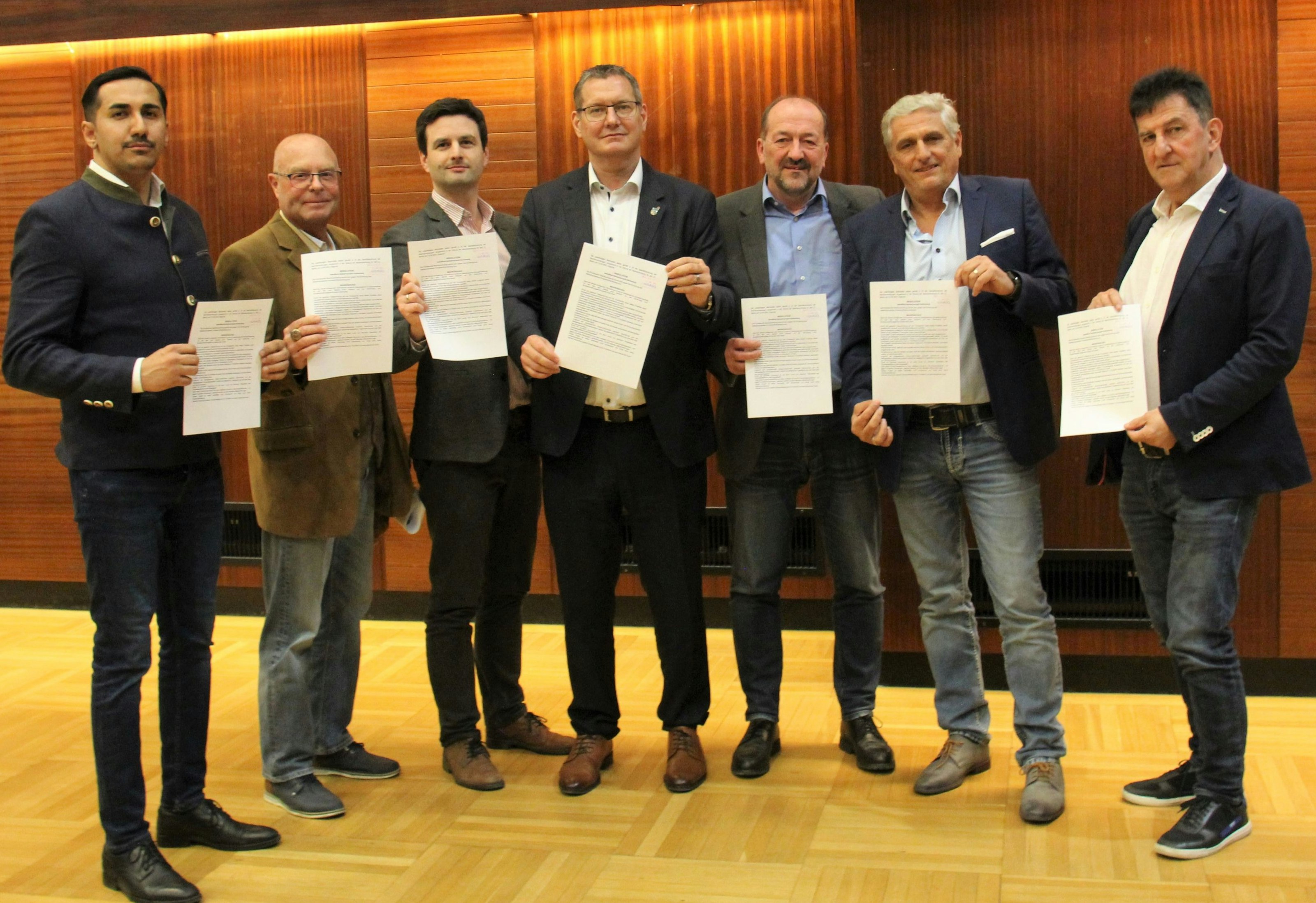 Bezirksvorsteher Georg Papai (SPÖ) mit den Klubobleuten der Bezirksvertretung – diese sprach sich in einer Resolution gegen eine Seilbahn auf den Kahlenberg aus.