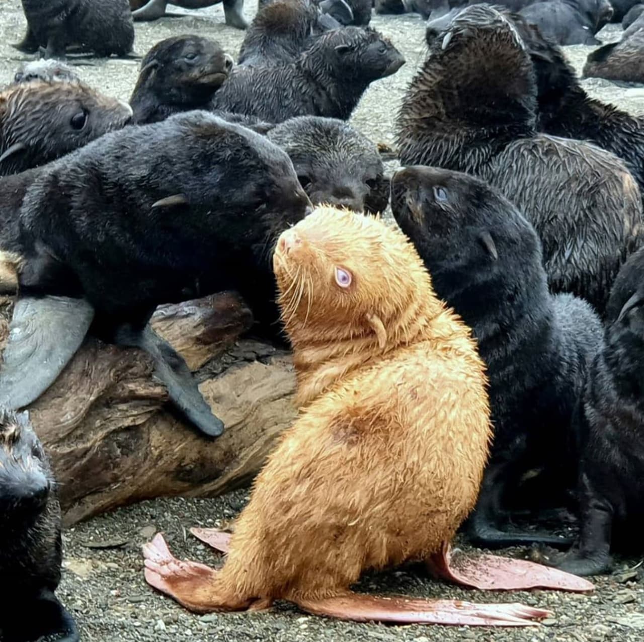 Ein Robben-Baby mit von der Norm abweichender Pigmentierung tanzt zwischen seinen Artgenossen mit seinen rosa Flossen und rötlichem Fell aus der Reihe.