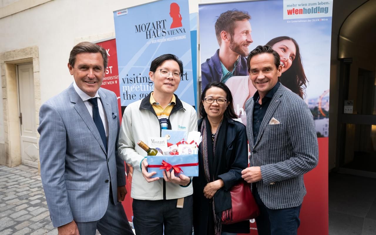 Das Ehepaar Li Li Teo und Gatte Chun Yew Wong aus Singapur sind der zweimillionste Gast im Mozarthaus Vienna, Wirtschaftsstadtrat Peter Hanke (li.) und Wien Holding-Chef Kurt Gollowitzer (re.) gratulierten herzlich.