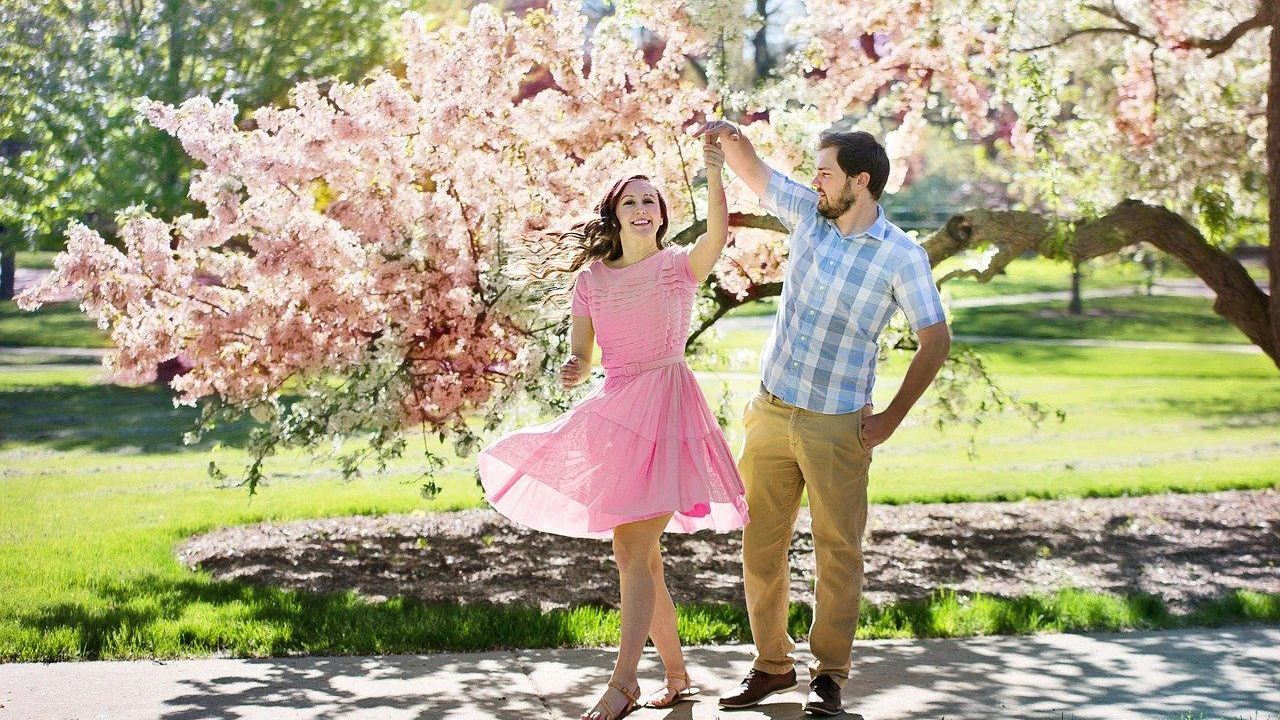 Paar im Frühjahr unter Kirschblüten