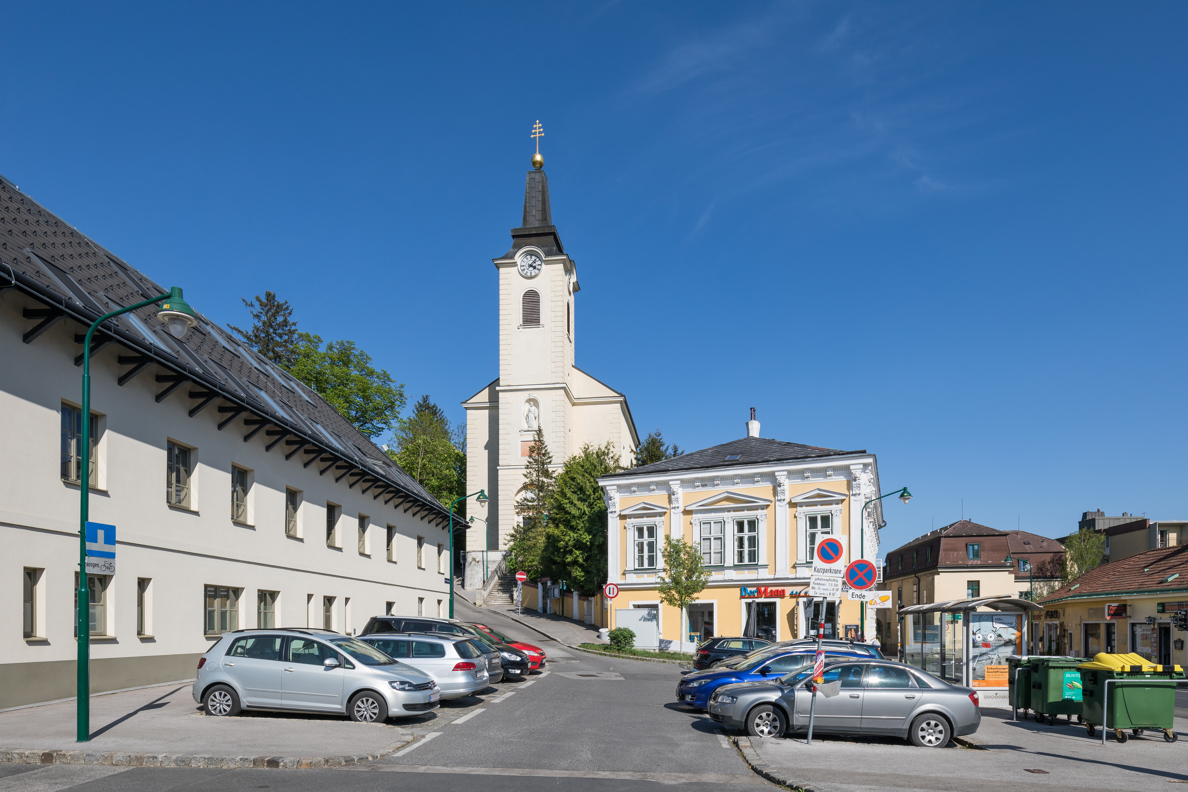 Der Kalksburger Kirchenplatz mit der Pfarrkirche "Zum heiligen Petrus in Ketten" in Wien-Liesing.