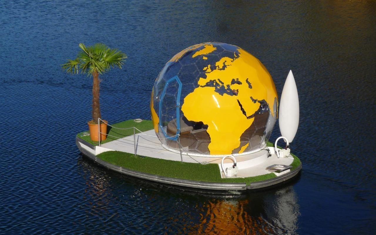 Ab sofort sofort laden Inselboote mit Erdkugel auf der Alten Donau zur "Weltreise".