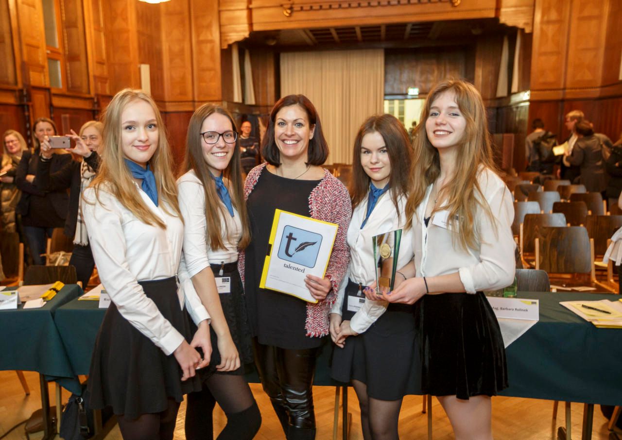 (v.l.n.r.) Die Schülerinnen Nina Gierlinger, Lara Drozda, Polina Pozdnyakova und Karla Oder nahmen Jury-Mitglied und Unternehmerin Katharina Schneider in die Mitte.