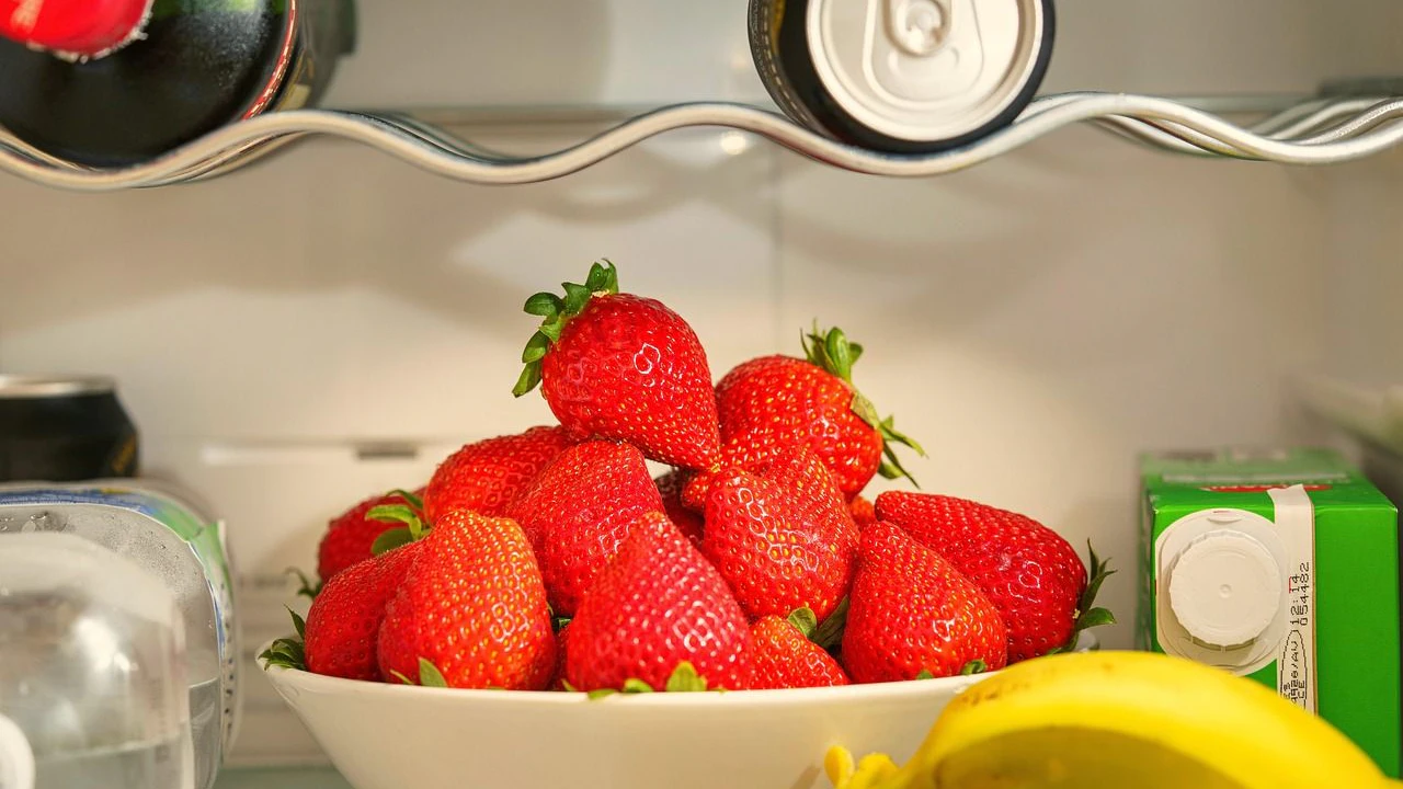 Offener Kühlschrank mit frischen Erdbeeren