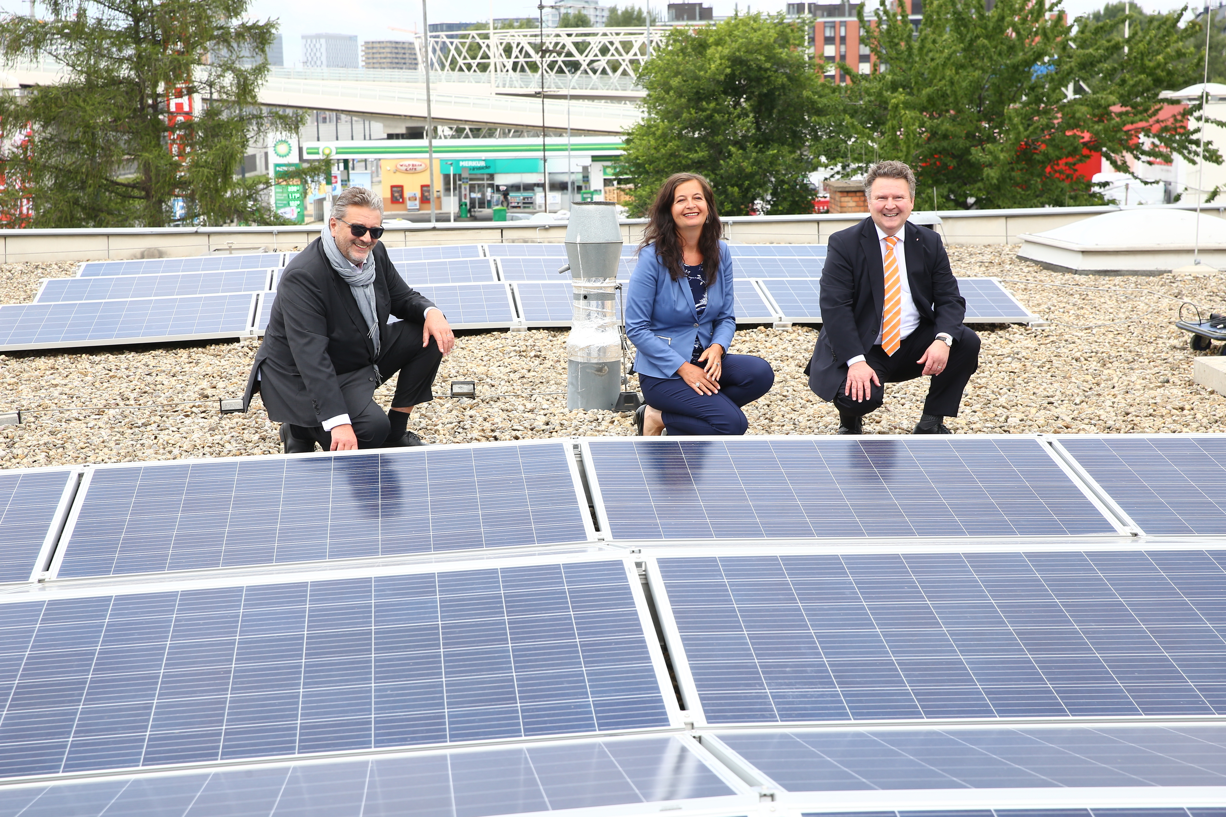 Gesundheitsstadtrat Peter Hacker, Umweltstadträtin Ulli Sima und Bürgermeister Michael Ludwig (v.l.n.r.) präsentierten die neue Photovoltaikanlage auf dem Dach der Rettungsstation Arsenal in Wien-Landstraße.