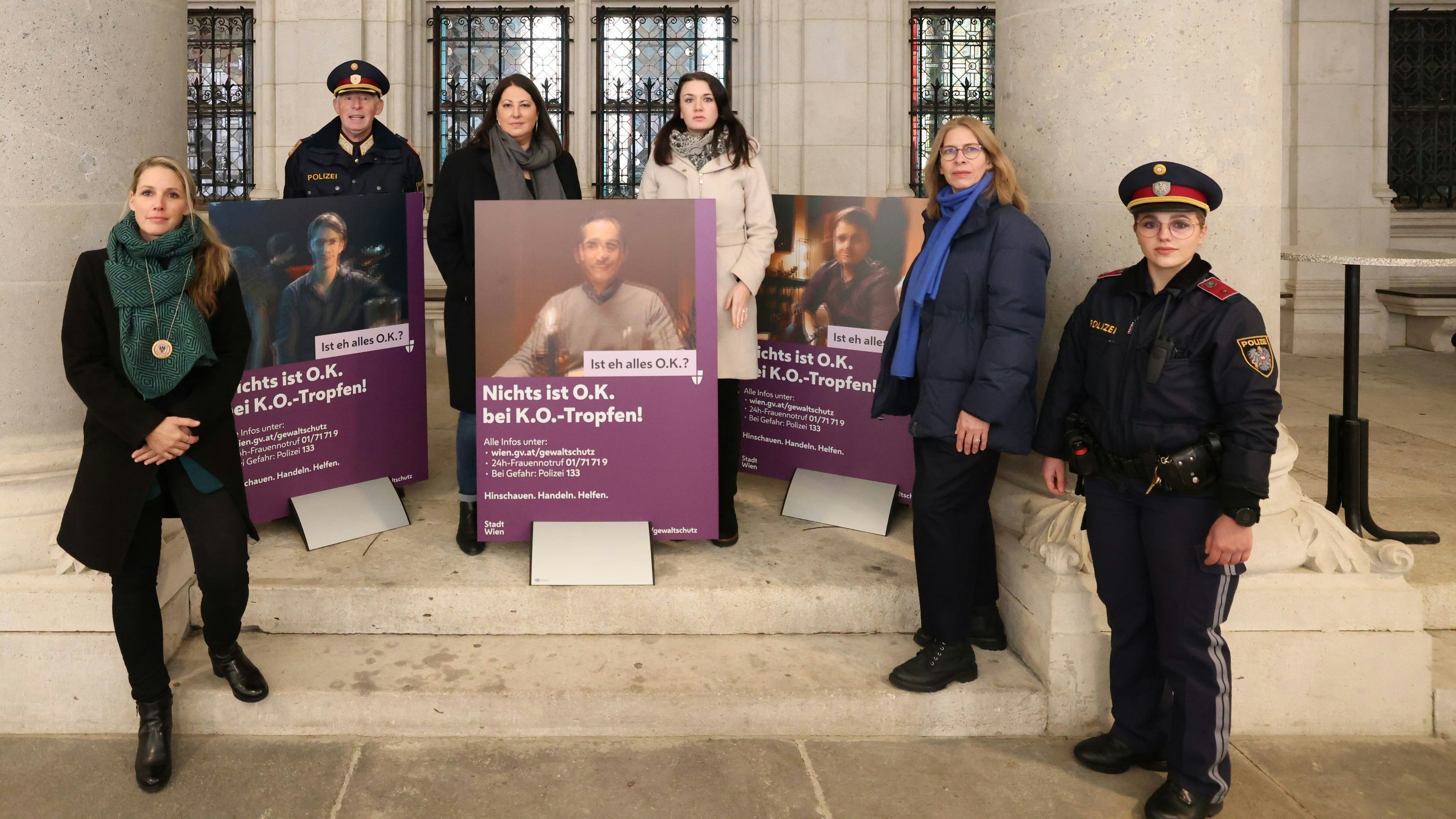 Startschuss der Kampagne "Nicht ist O.K. bei K.O.-Tropfen" V.l.n.r Catrin Weniger (Bezirksinspektorin), Michael Lepuschitz (Wiener Landespolizeivizepräsident), Kathrin Gaál (Vizebürgermeisterin und Frauenstadträtin), Dolores Bakos (Gemeinderätin und NEOS-Frauensprecherin), Heidemarie Kargl (Frauennotruf-Leiterin) und Madeleine Deleja-Hotko (Inspektorin).