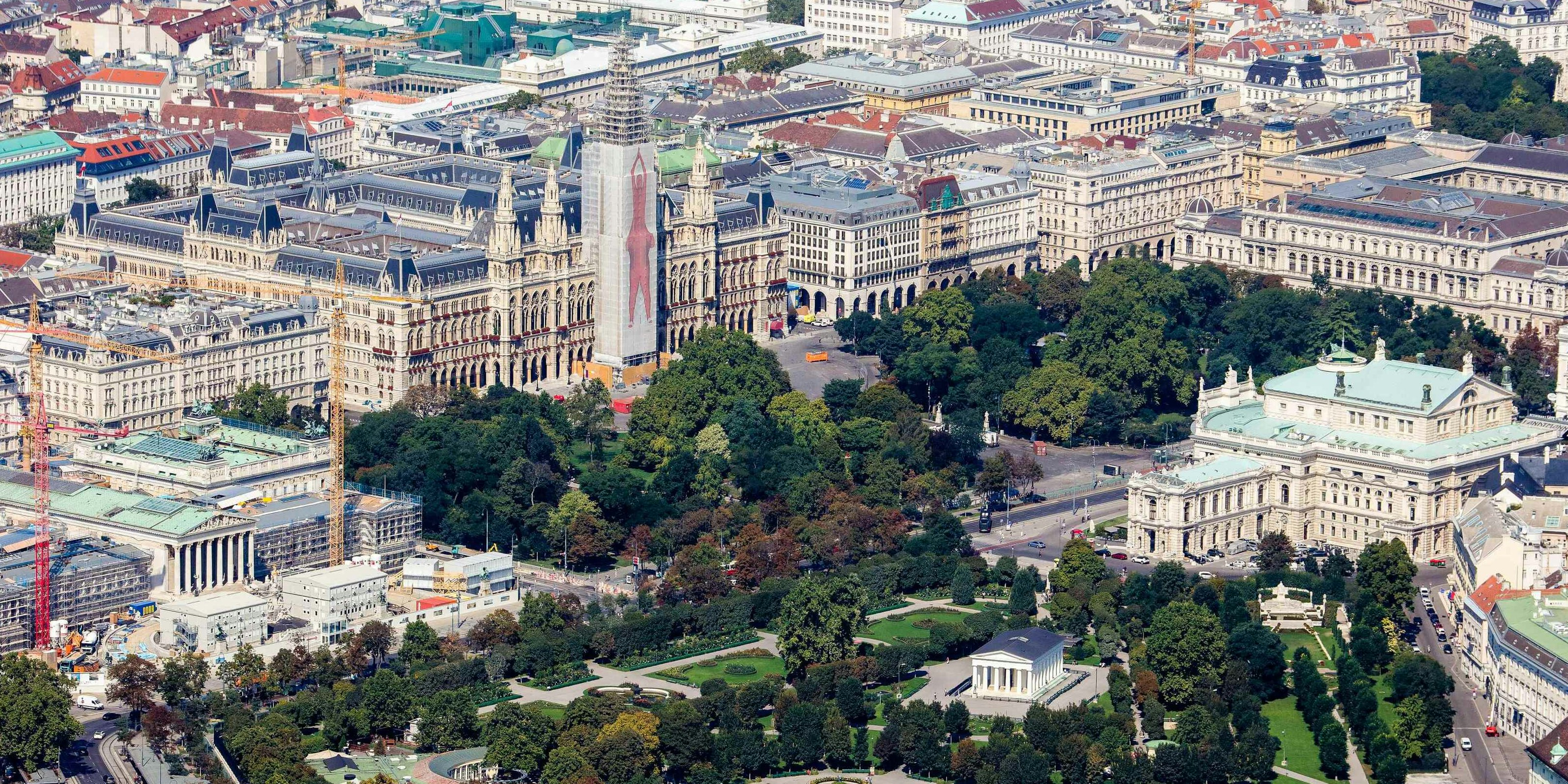 Blick auf das Rathaus, im Vordergrund das Burgtheater und der Volksgarten