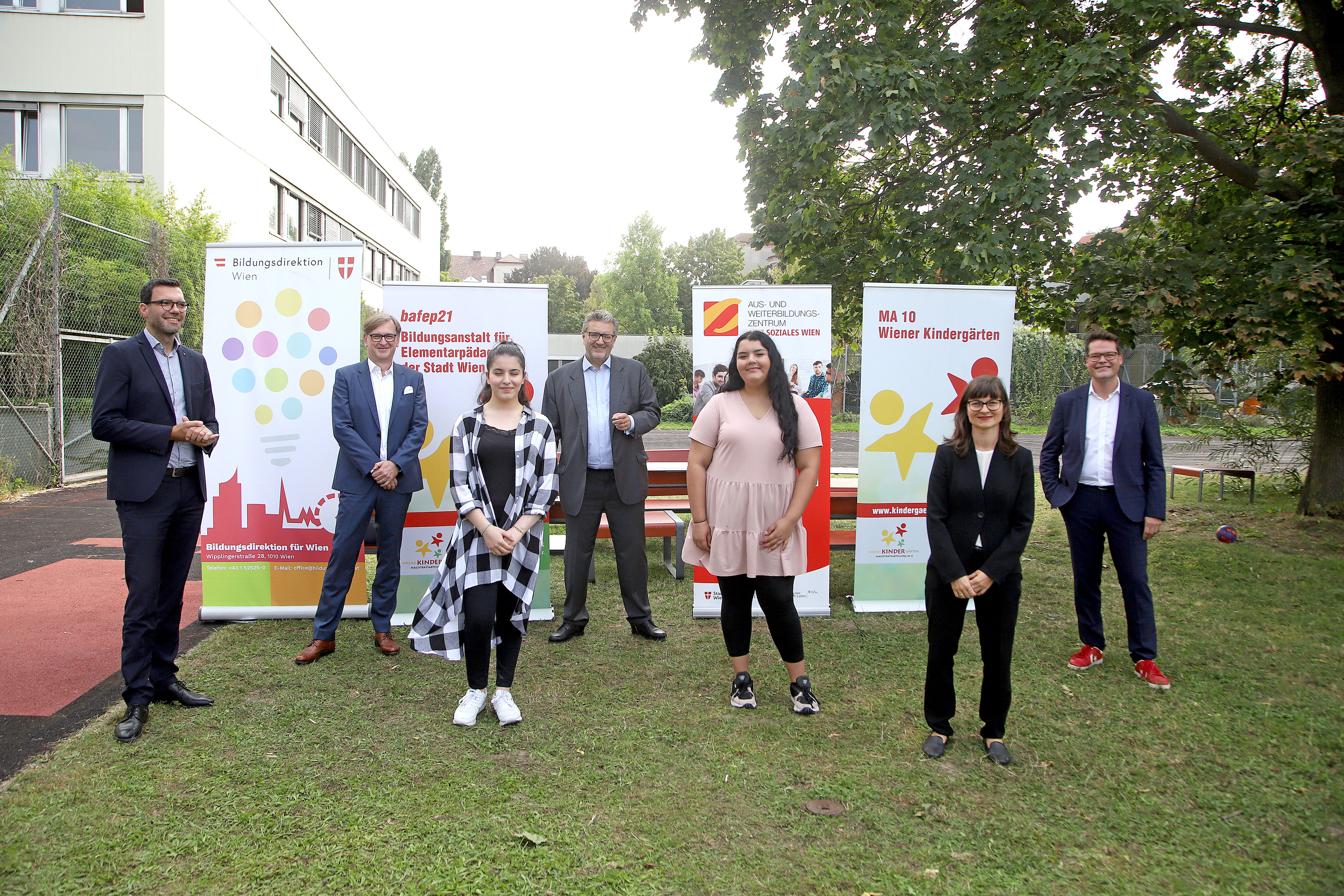 Seit 7. September läuft in Wien-Floridsdorf der Schulversuch "Pflege mit Matura". 16 Schülerinnen und Schüler, darunter Lina Hafaiedh (l.) und Salmaz Ahmadzada, sind dabei und bekamen Besuch von (v.l.n.r.) Bildungsdirektor Heinrich Himmer, dem stellvertretenden Geschäftsführer des FSW Christian Hennefeind, Sozialstadtrat Peter Hacker, bafep21-Direktorin Nicole Kalteis und Bildungsstadtrat Jürgen Czernohorszky.