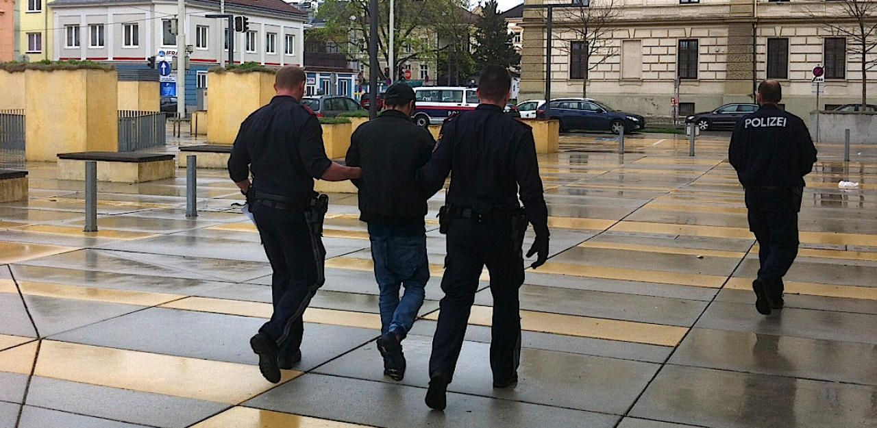 Der verurteilte Afghane wird von Polizisten zurück in die Schubhaft geführt.