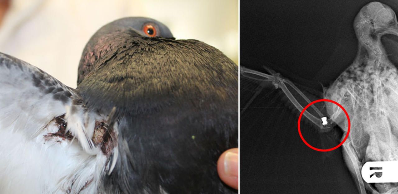 Die verletzte Taube, das Röntgenbild zeigt das Projektil.