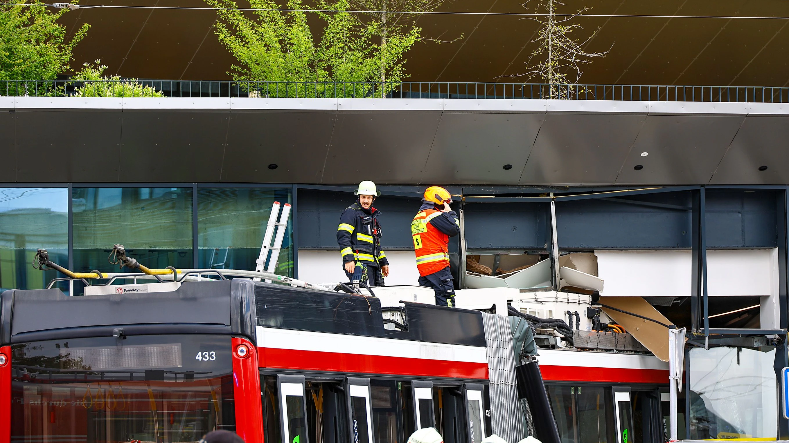 Obus krachte in Billa: Einsatzkräfte stehen am schwer beschädigten Gebäude, während Statiker die Stabilität der Filiale prüfen.