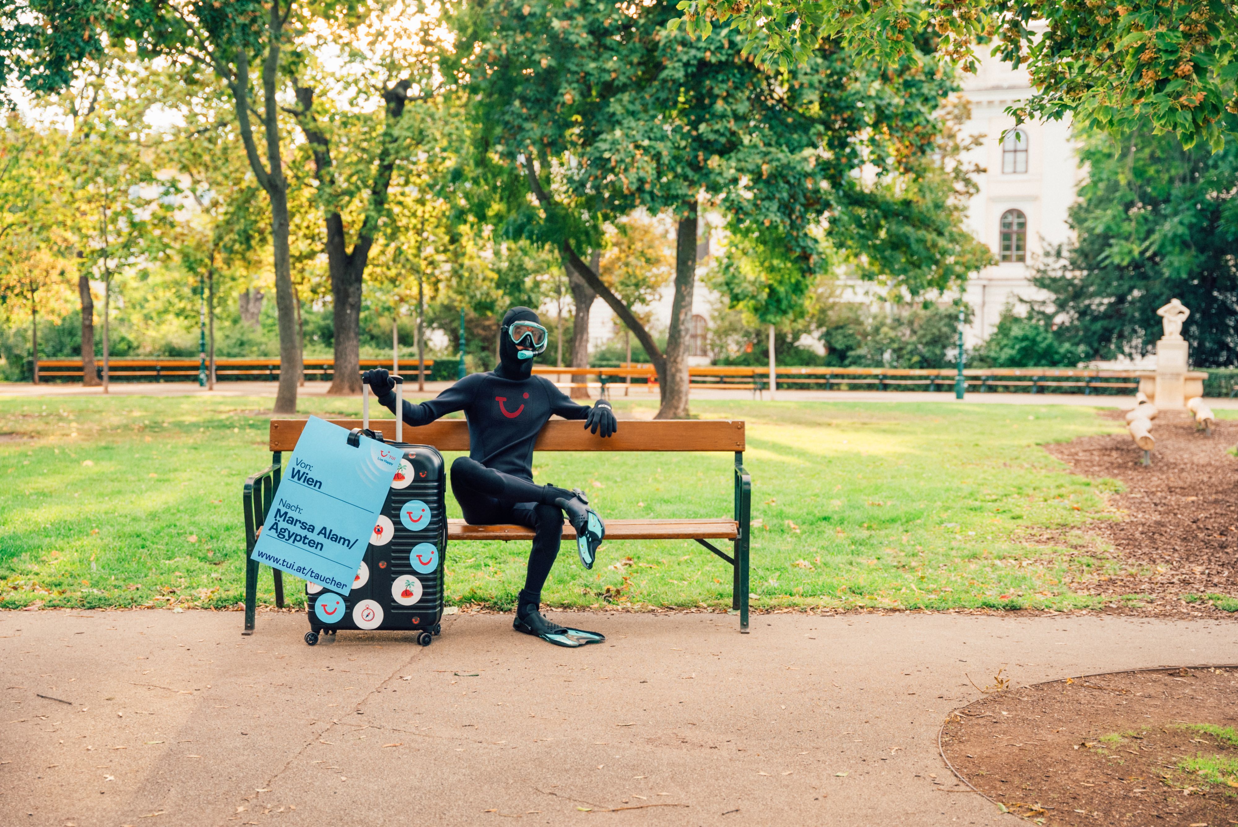 Der Taucher im Neoprenanzug ist bis 2. Oktober auf den Straßen Wiens unterwegs.