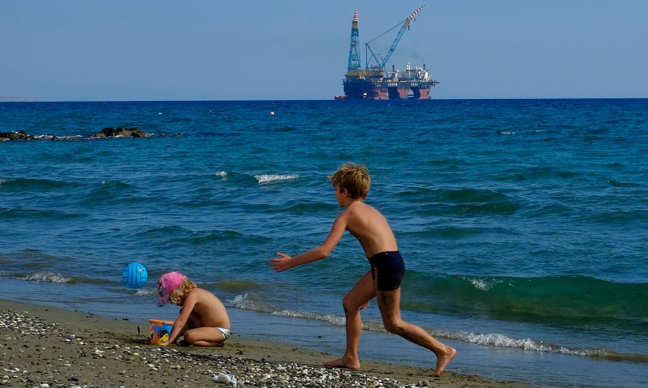 Kinder spielen an einem Strand am Stadtrand von Larnaca. Im Hintergrund steht eine Bohrplattform.