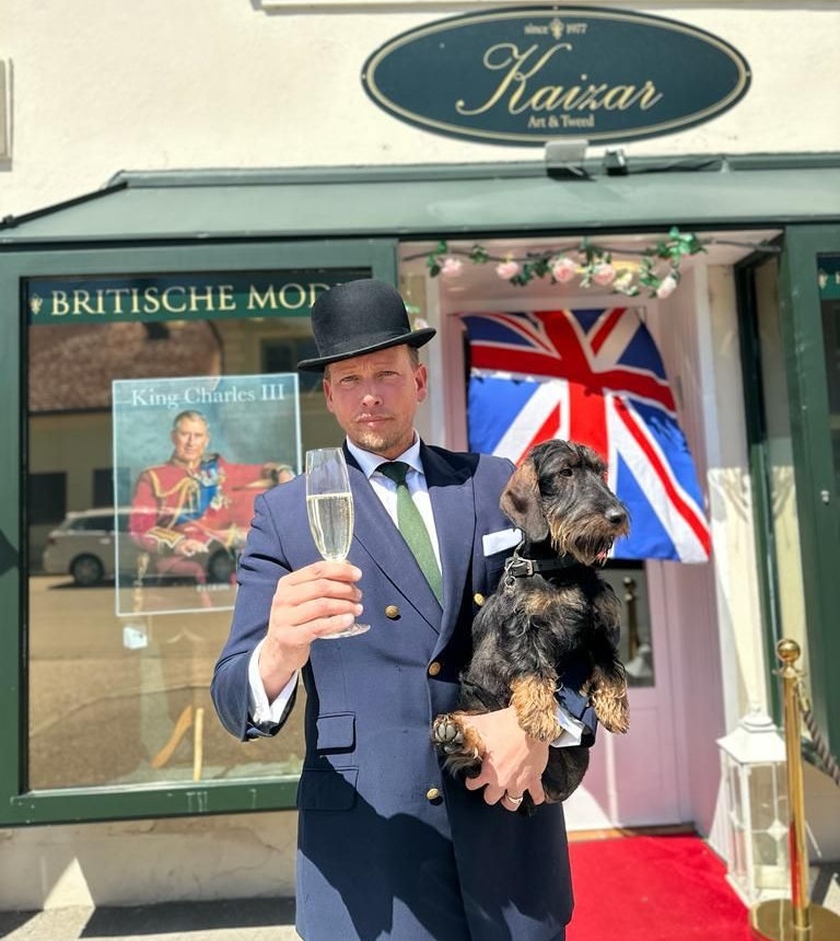 In der Boutique „Kaizar Art & Tweed“ feiern Unternehmer Werner Kaizar und „Sir Winston“ die Krönungsfeier von Charles.
