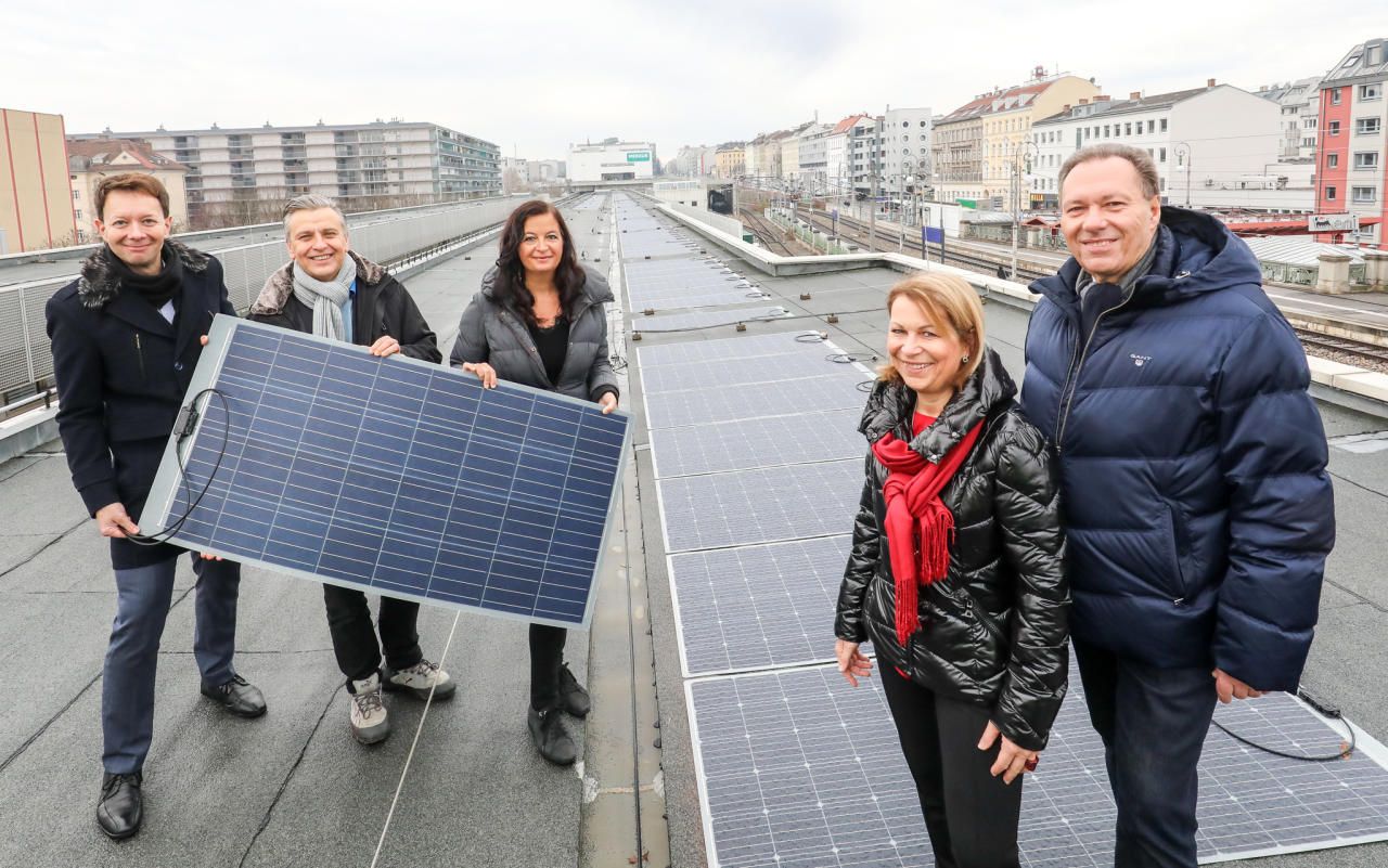 Mittels Photovoltaik-Folien soll die U3-Station Ottakring selbst den Strom für ihre Rolltreppen erzeugen (v.l.n.r.: Wien Energie-Geschäftsführer Karl Gruber, SP-Klubchef Josef Taucher, Öffi-Stadträtin Ulli Sima, Wiener Linien-Geschäftsführerin Alexandra Reinagl und Bezirkschef Franz Prokop)
