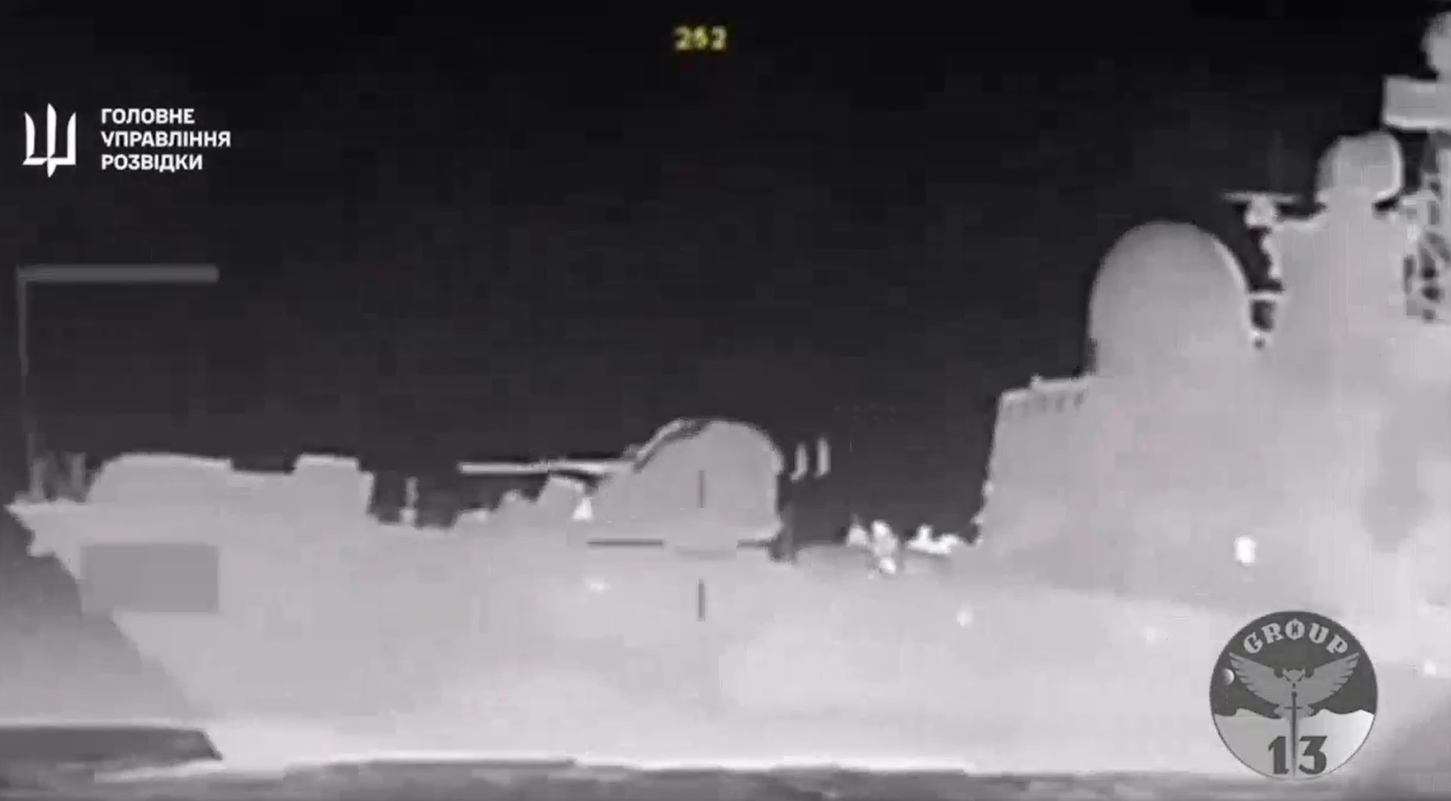 Auf einem Video ist zu sehen, wie mehrere mit Sprengstoff beladene Seedrohnen auf das russische Kriegsschiff zusteuern und explodieren.