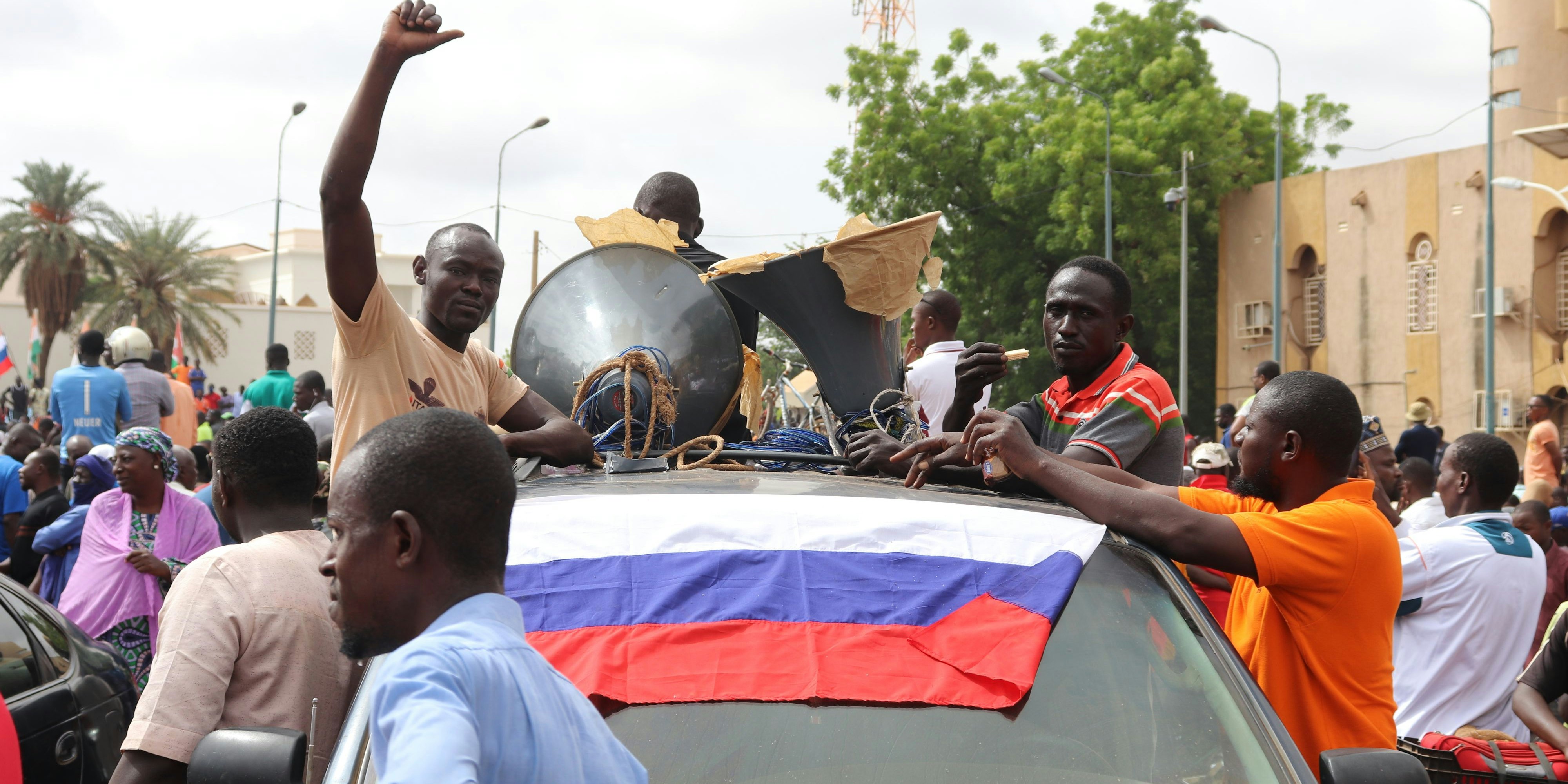 Menschen demonstrierten letzte Woche, um ihre Unterstützung für die Putschisten zu zeigen. Bei der Demonstration wurden Parolen gegen Frankreich gerufen und russische Flaggen getragen.