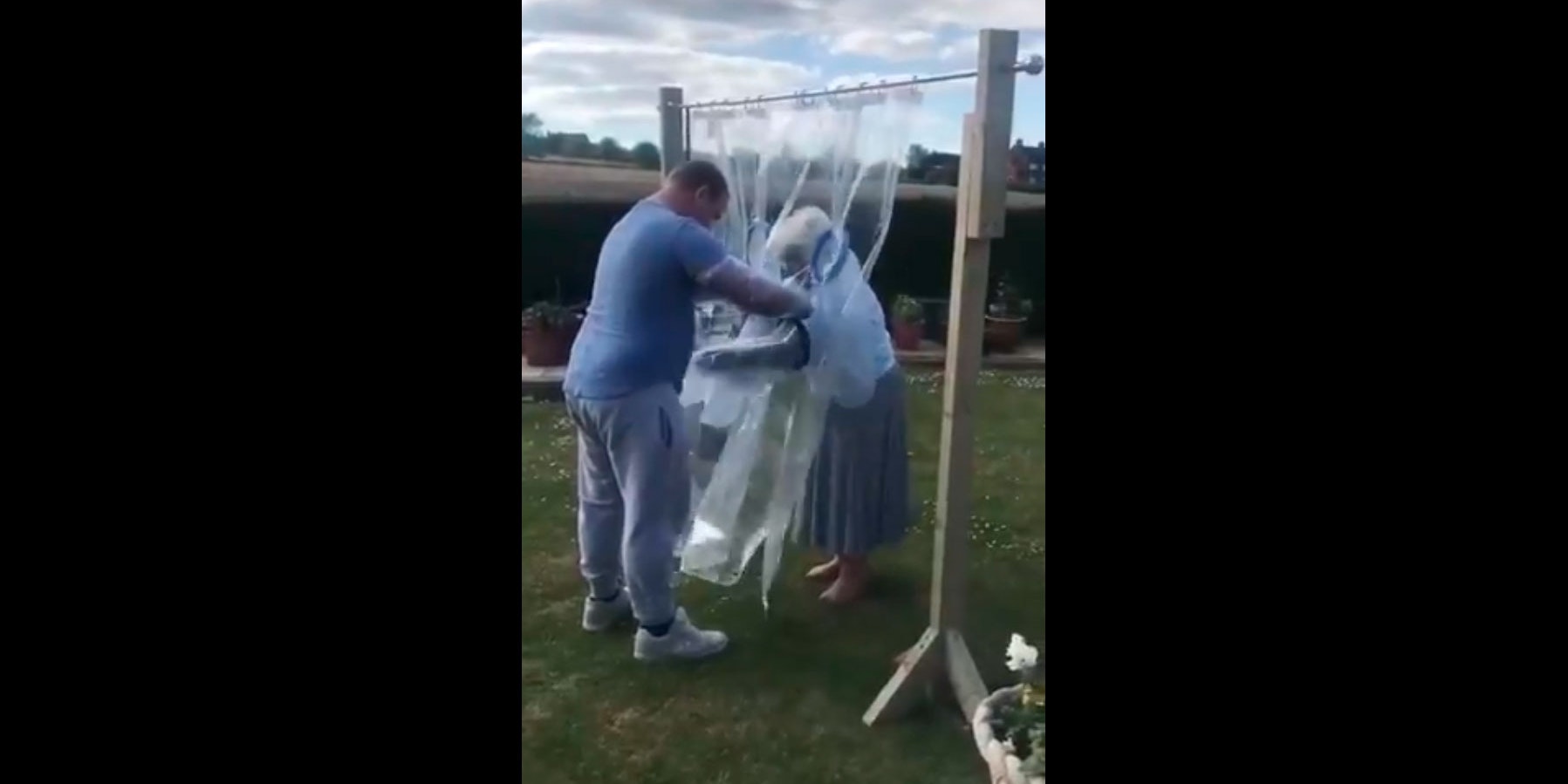 Dank dem selbstgebastelten "Umarmungsvorhang" kann die Britin ihren Sohn ohne Corona-Angst umarmen.