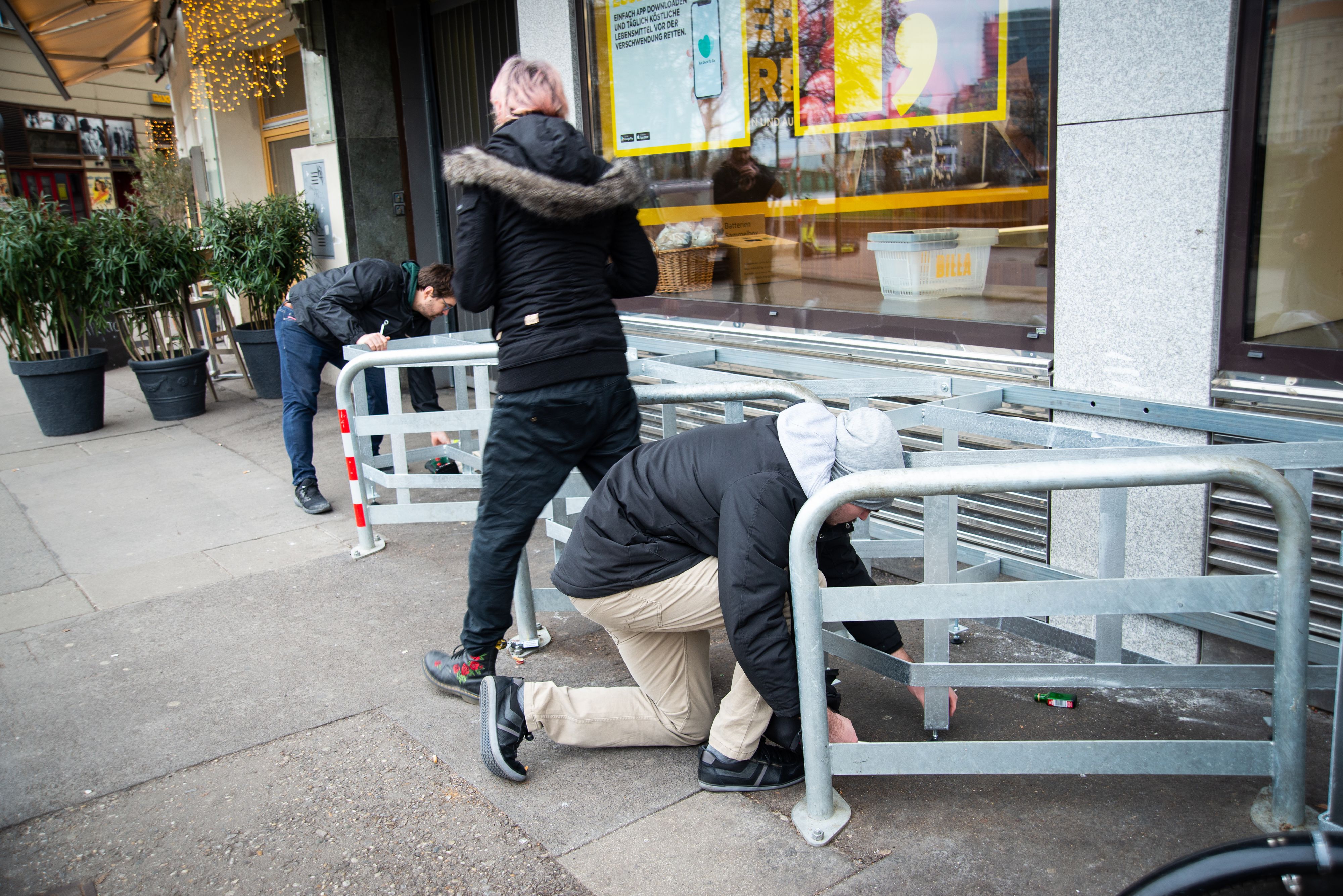 Aktivisten der Partei Links montierten die ohne Genehmigung errichtete Metall-Konstruktion vor einem Gebäude am Schwedenplatz wieder ab.