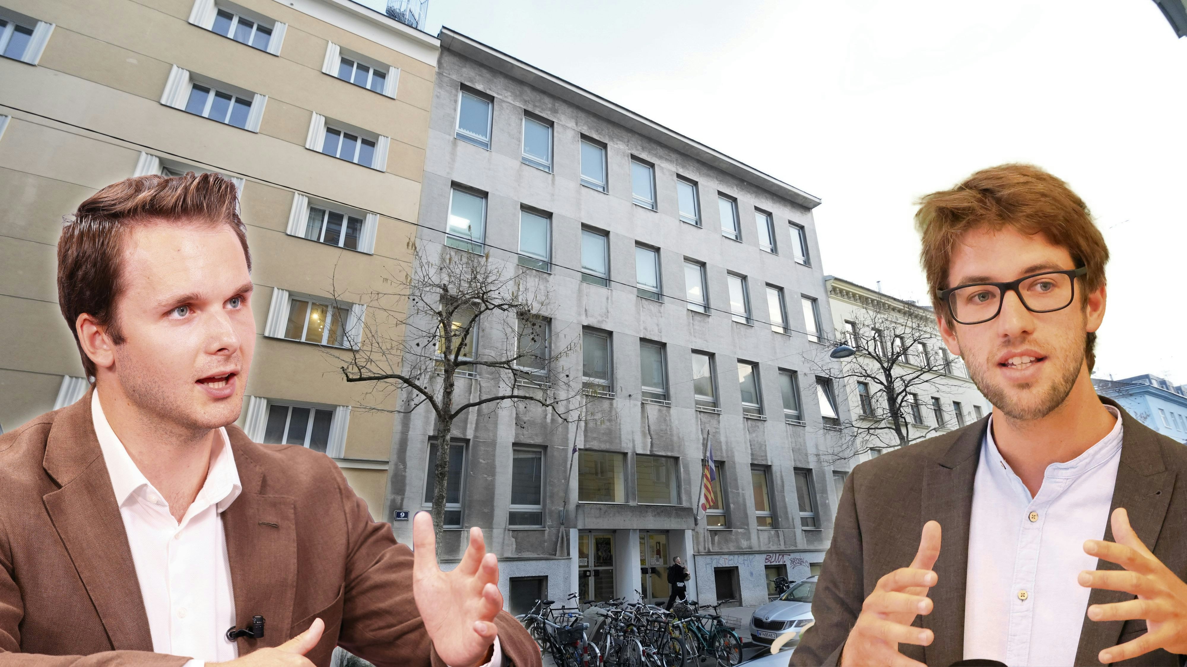 Harald Zierfuß (ÖVP) und Felix Stadler (Grüne) kritisieren die Verzögerungen des Schulstandortes Castelligasse (v.l.).