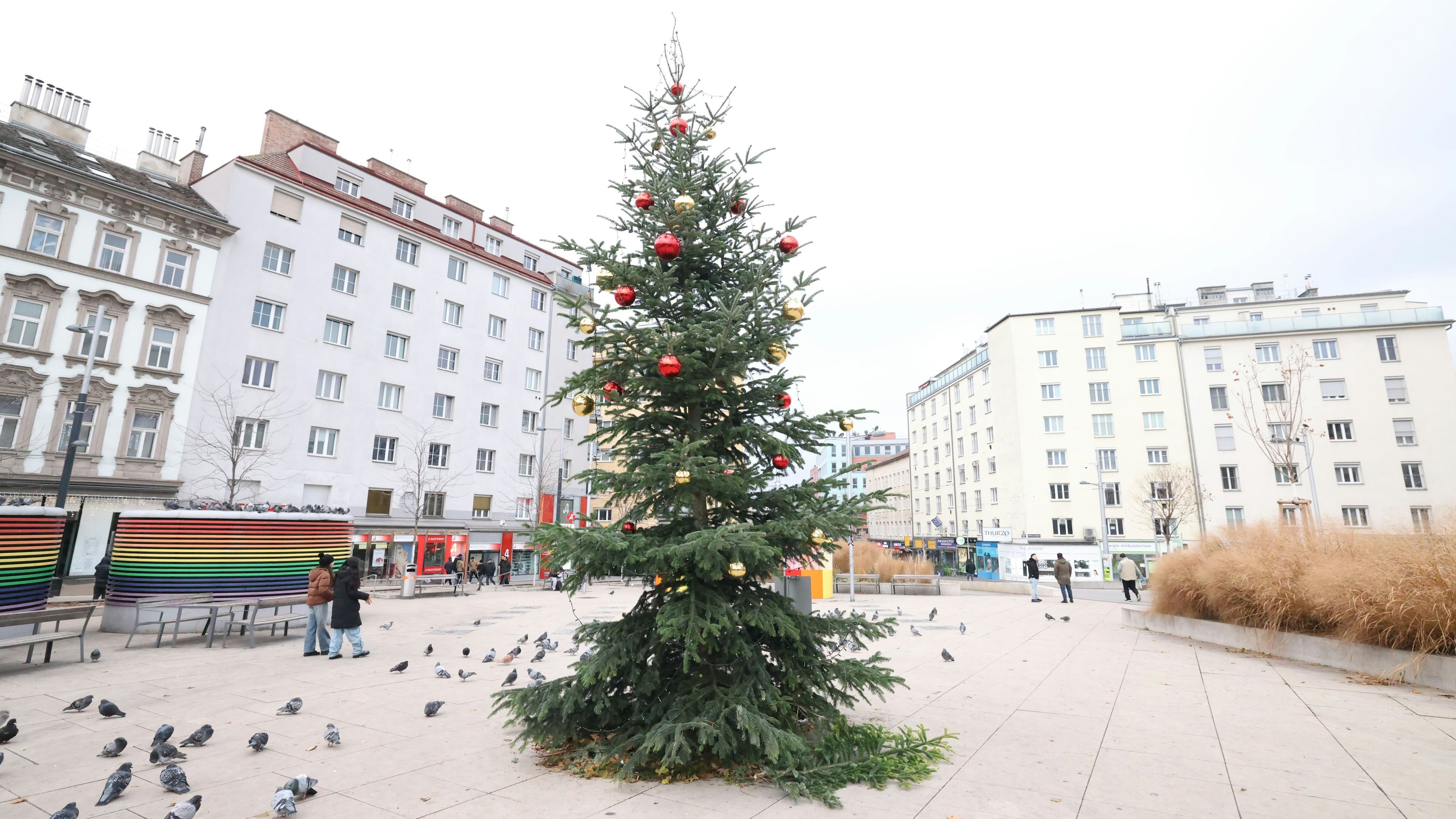 Favoritens berühmtester Baum: Nach unten hängende Äste, fehlende Kugeln und mitten im Polit-Sturm – der Reumannplatz hat einen neuen Star.