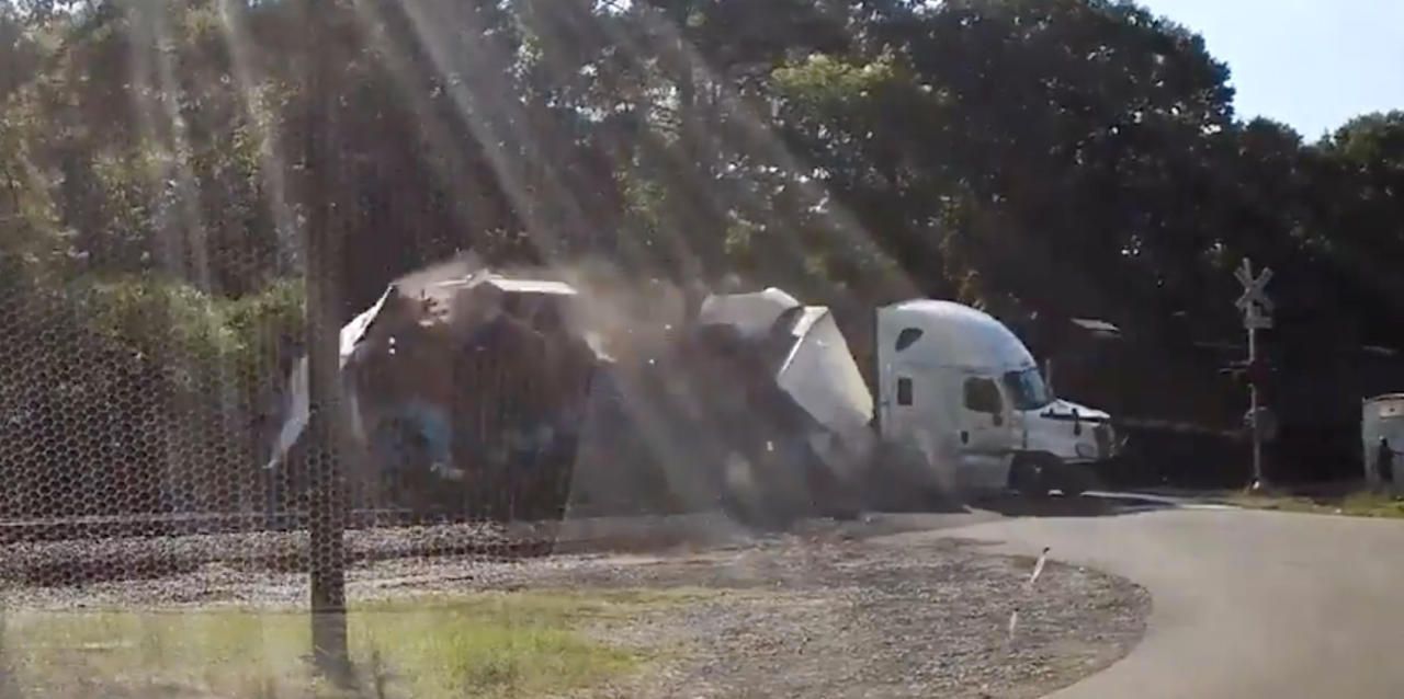 Krawumm: Der Zug hat den Truck erwischt und teilt ihn in zwei Hälften!