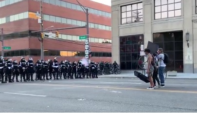 Das ist der Moment, indem ein Polizist das Geschoss abfeuert.
