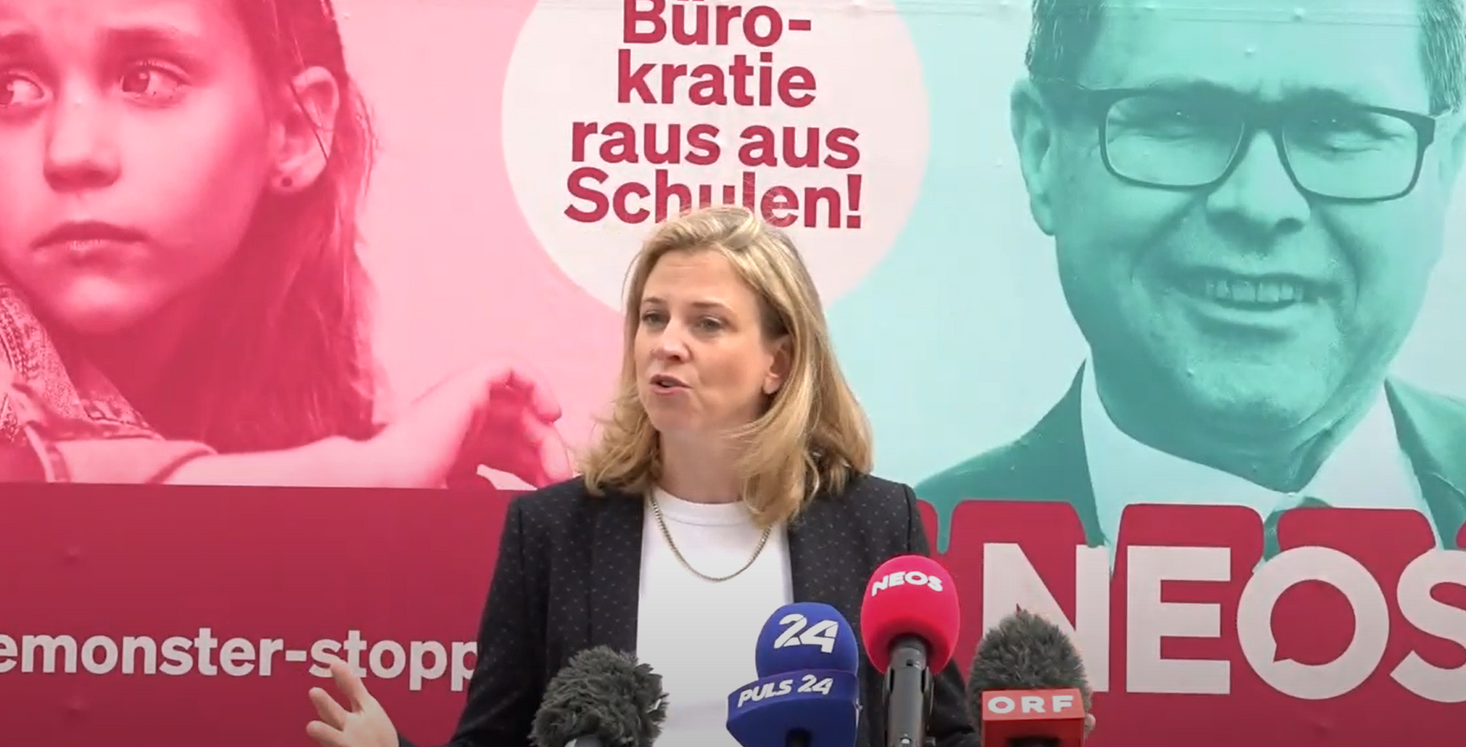 "Das Bürokratiemonster gehört eingefangen", sagte NEOS-Klubobfrau Beate Meinl-Reisinger bei der Pressekonferenz vor dem Bildungsministerium am Montag.