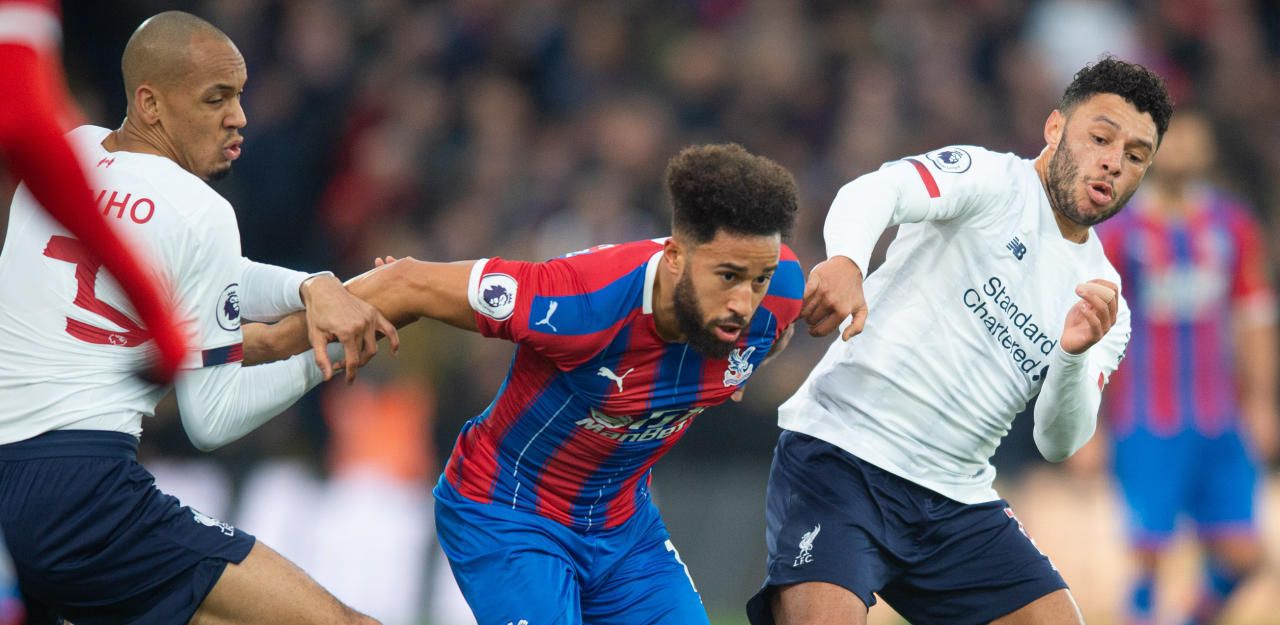Andros Townsend (Mitte) im Zweikampf mit den beiden Liverpool-Stars Fabinho (links) und Alex Oxlade-Chamberlain (rechts).