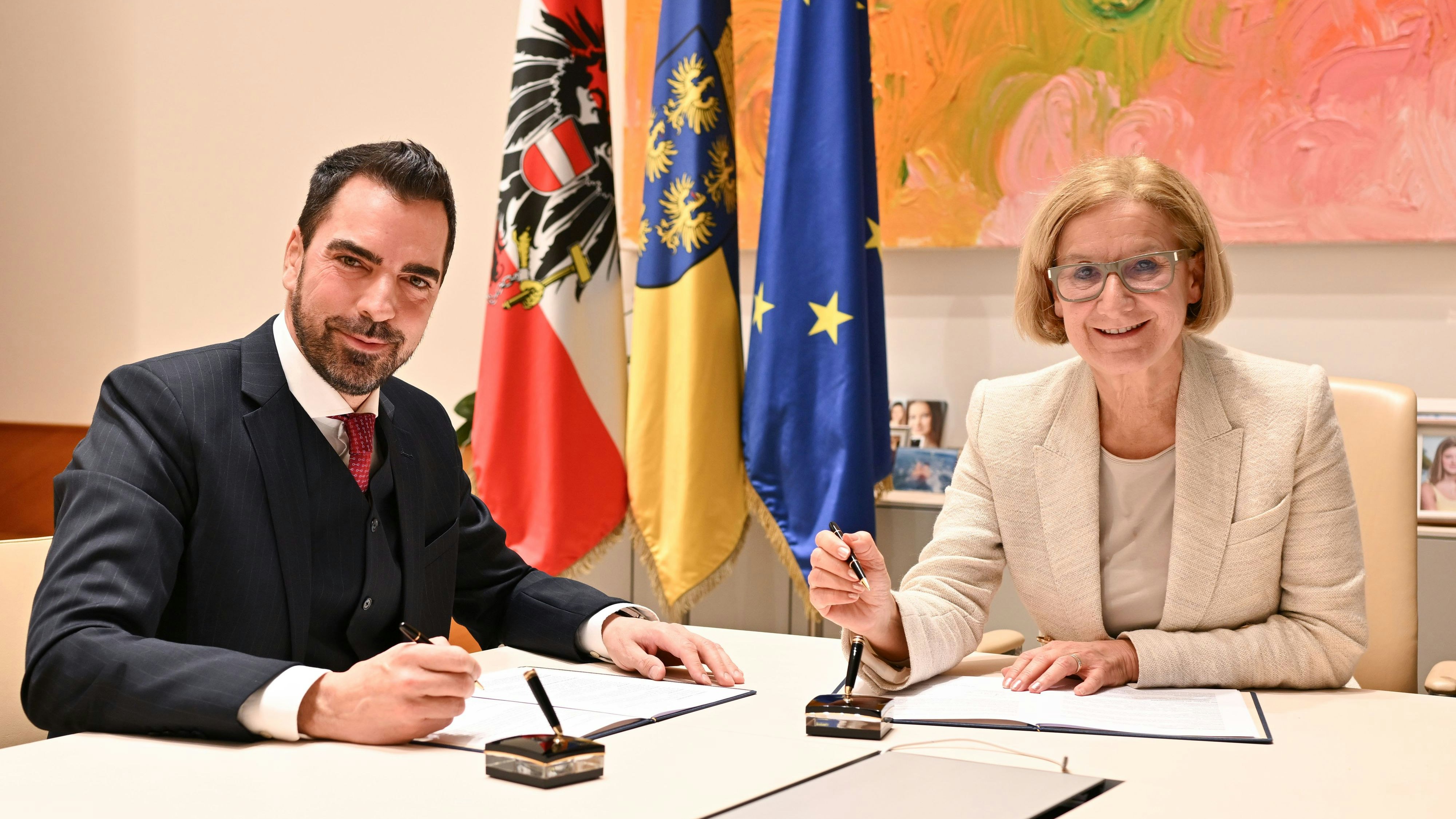Kari Ochsner (li.) und Johanna Mikl-Leitner unterzeichneten ein Standortabkommen, das die Industrie in NÖ stärken soll.